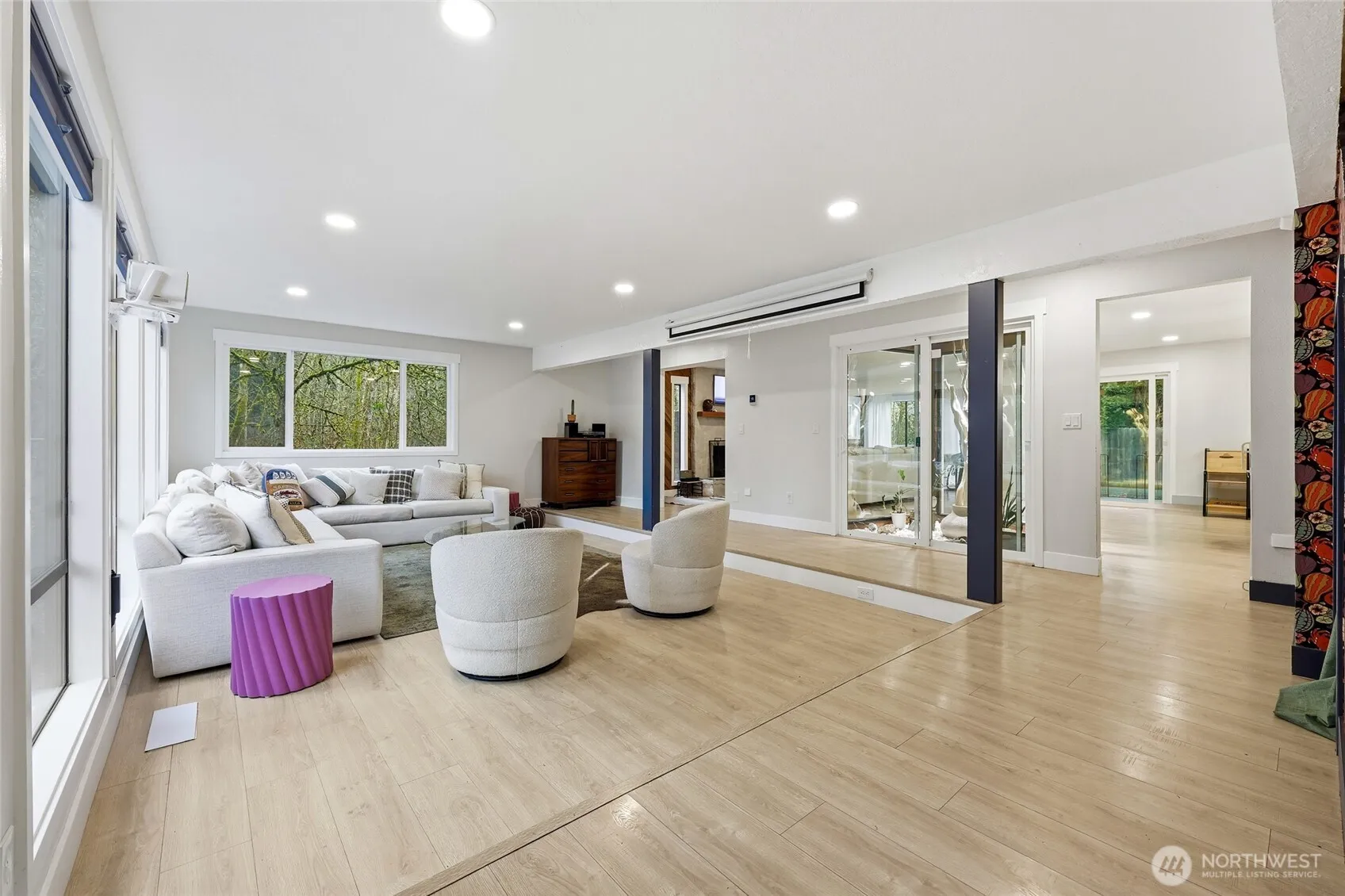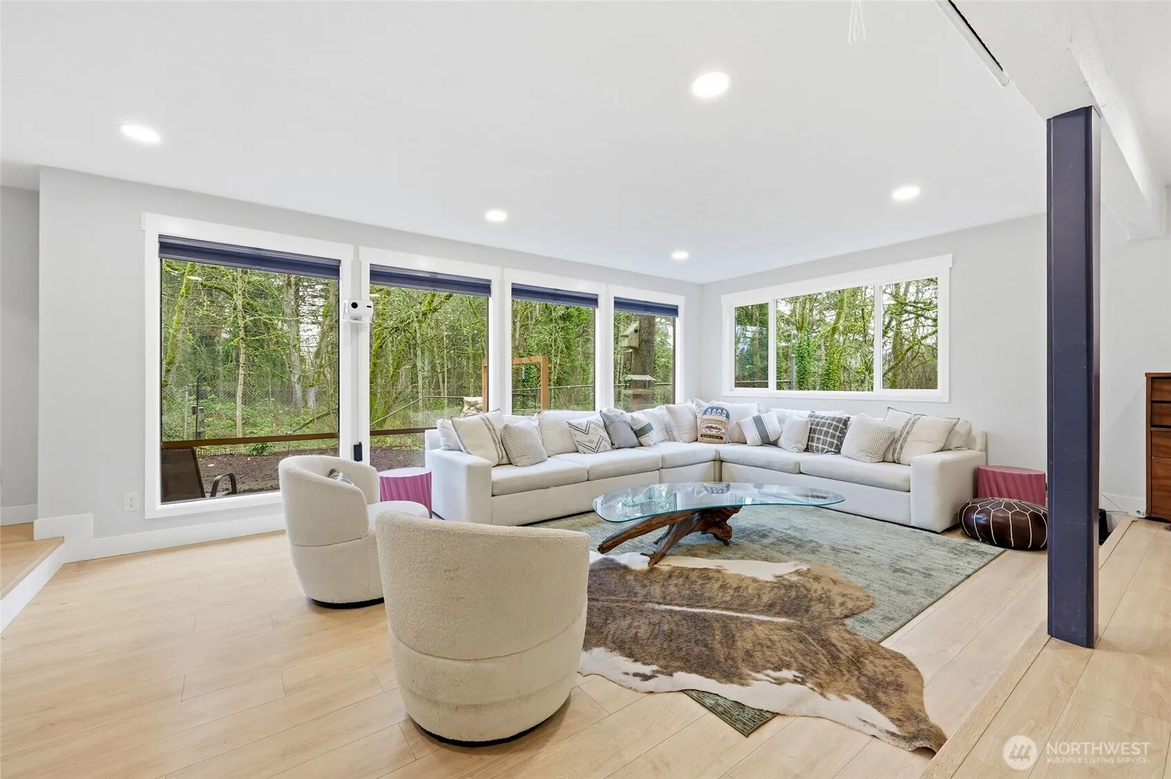 Just beyond Royal Oaks Golf Club, tucked at the end of the street, this home feels more discovered than found. The most private property on the block features a dramatic two-story atrium with a skylight, where greenery thrives year-round. Expansive windows frame views of the oak preserve and swimming pool. A sunken, forest-facing living room offers an intimate gathering space with restored wood walls and an updated wood-burning fireplace. Outside, native landscaping surrounds a private in-ground kidney-shaped pool over eight feet deep with a hot tub. The primary suite includes a tucked-away “treehouse” office nook, private deck access, hickory engineered hardwood, and newer HVAC, roof, and water heater.