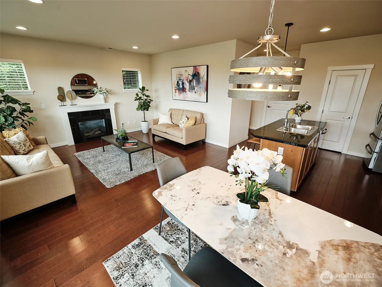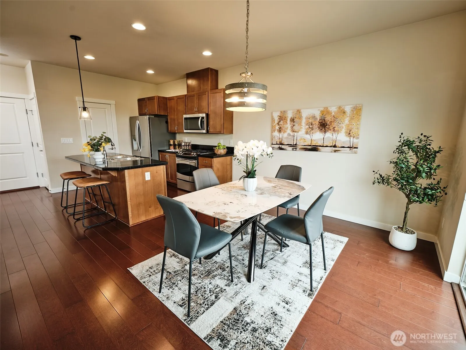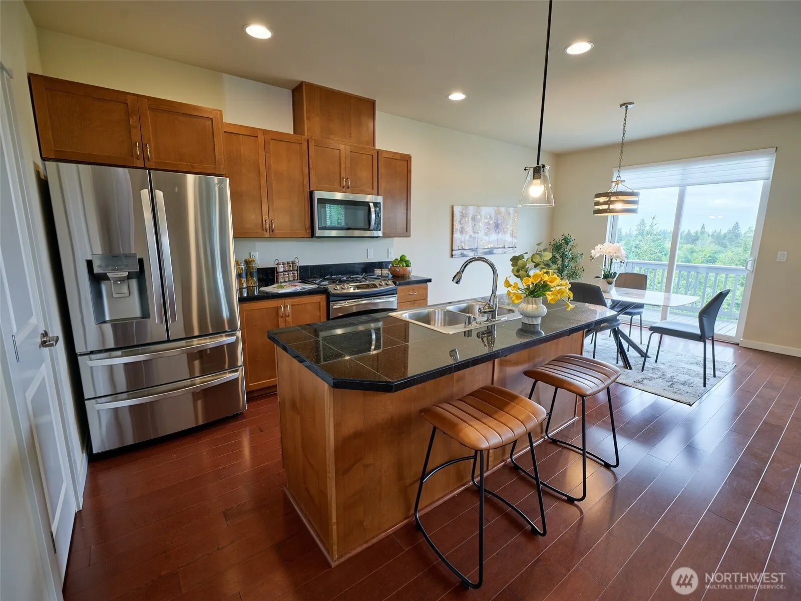 Gorgeous views of the Bellevue skyline and the Olympics from this conveniently located home. High ceilings and lots of windows add tons of natural light. Roomy four bedrooms and an end unit location make this live like a single family home. Open kitchen/dining/living room area with gas fireplace and view deck. Central A/C, Vinyl Flooring, Stainless appliances, pantry, granite counters. Luxury main bedroom with 5 piece en-suite and walk-in closet. Three other large bedrooms, full bath, and utility room on second floor. Side-by-side, two car garage with epoxy coated floor and tons of built-in storage. Easy access to downtown Newcastle; The Golf Club at Newcastle; YMCA, Cougar Mountain Park/trails and so much more. Issaquah schools.