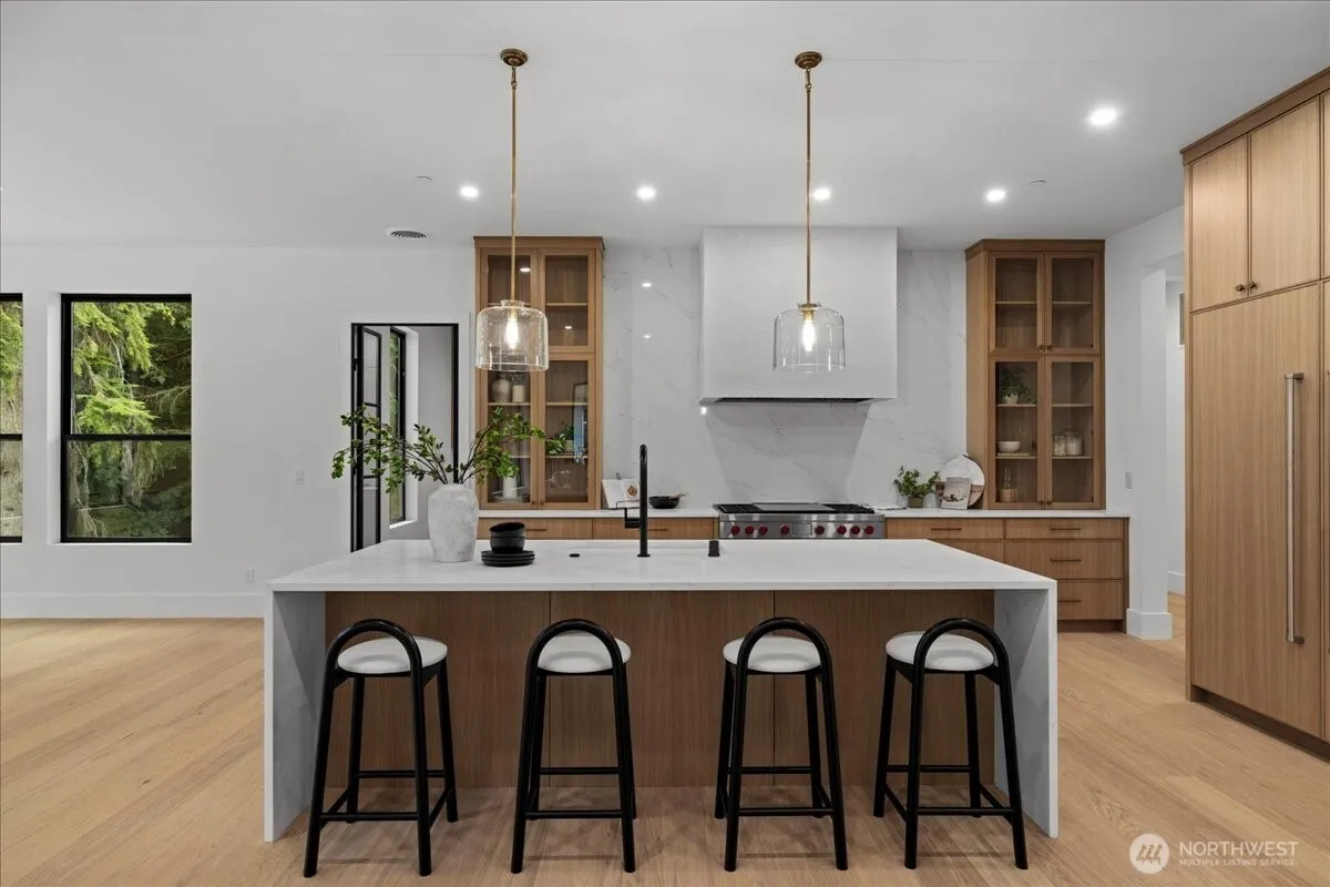 Luxury new construction in Canterwood Country Club. The grand entry opens to a soaring 20-ft ceiling living room with wide-plank oak floors, plaster fireplace, and oversized picture windows. Chef’s kitchen showcases a 9-ft waterfall island, Sub-Zero and Wolf appliances, plus a second prep kitchen with high-end appliances and Gaggenau wine fridge. Main-floor primary suite offers vaulted ceilings, steam shower, spa bath, walk-in closet, and private deck. Upstairs includes three bedrooms, one serving as a second primary suite with private deck. The lower level adds 2,000 sq. ft. with full kitchen, private entry, and covered patio. The .47 acre lot backs to a protected green space. Enjoy Canterwood’s gated golf, clubhouse, pool, and amenities.