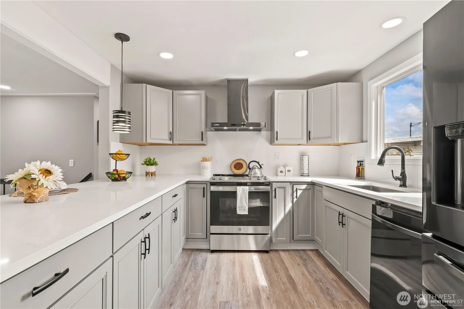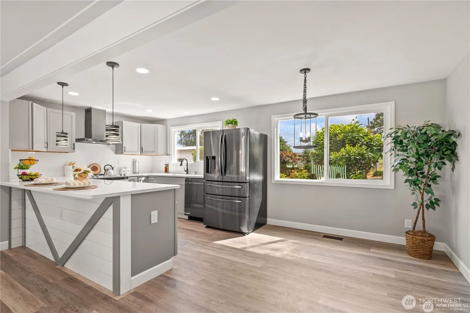 Stunning fully remodeled home featuring 5 bedrooms and 2 bathrooms in a spacious rambler with a finished basement. A wall has been installed downstairs for added privacy, creating a versatile layout with 3 bedrooms and 1 bathroom on the main level, and a 2-bedroom, 1-bath ADU on the lower level. This home offers ample space to accommodate all your needs, including an enormous 770 sq ft garage, two kitchens, and an additional family room downstairs, both with Fireplaces- perfect for entertaining. Both kitchens are equipped with stainless steel appliances, quartz countertops, and abundant cabinetry. Ideal for owner-occupants or investors—live upstairs and rent the lower level, or simply enjoy the generous living space. Step outside to a tremendous deck with partial views and a fully fenced, oversized backyard with green belt on the back for privacy. Conveniently located just 9 minutes from White Center and minutes from downtown Seattle, with easy access to downtown Burien, offering restaurants, shops, breweries, farmers markets, and public transit.