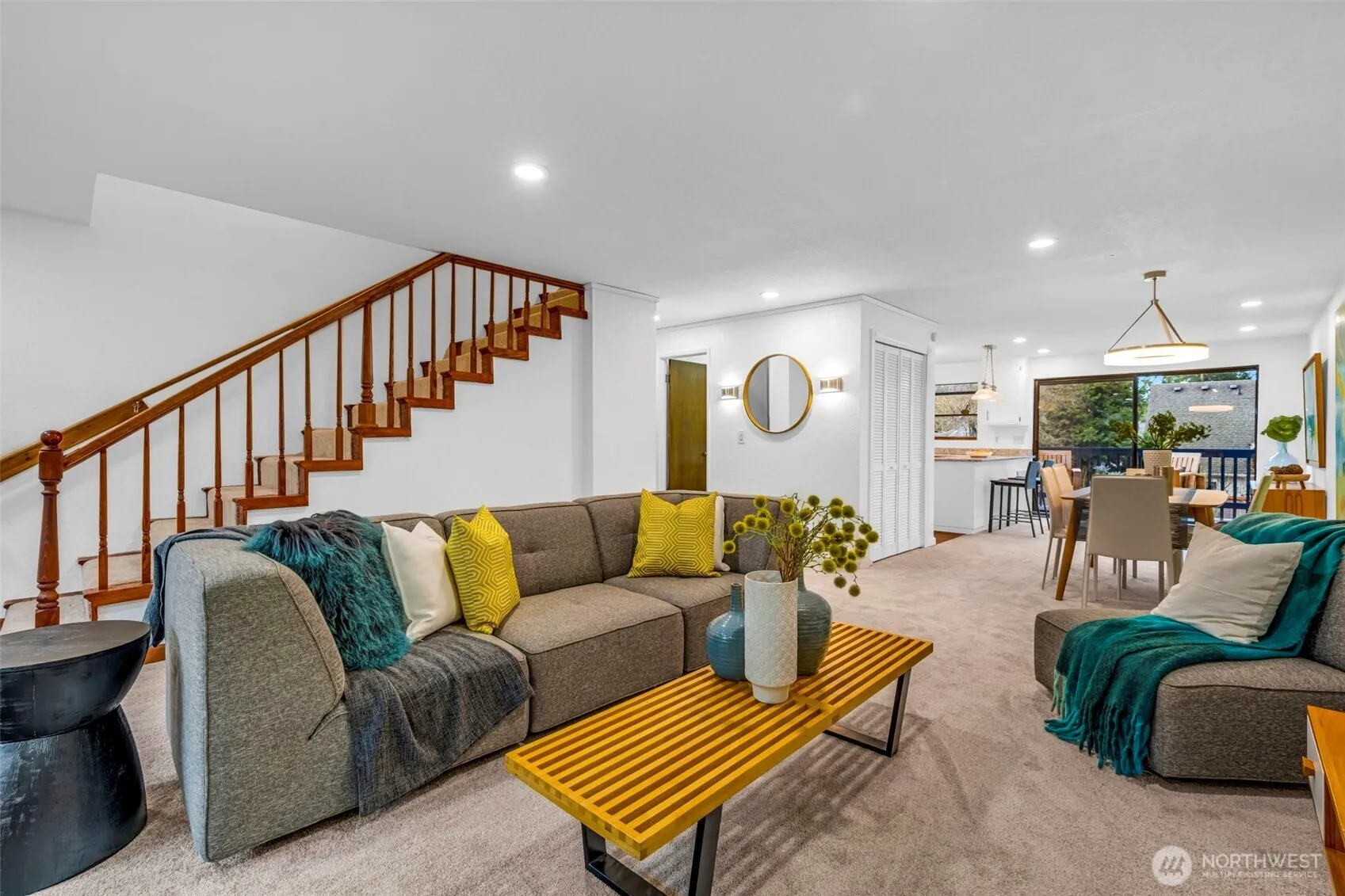 Tucked off N 175th—away from the traffic—this serene 3-level townhome-style condo offers the privacy of a single-family home in a peaceful, park-like setting surrounded by mature trees. With 1,728 sq ft of impeccably maintained, move-in-ready space, this is condo living without compromise. The open-concept main level welcomes you with a spacious living room and cozy wood-burning fireplace, dedicated dining area, powder room, and a beautifully remodeled kitchen featuring quartz countertops, custom tile work, and newer appliances. Fresh carpet on the main and lower levels adds warmth and comfort. Upstairs, the generous primary suite includes dual closets and an updated ensuite bath, plus a second bedroom and full guest bath. The versatile lower level offers a third bedroom or bonus family room with direct access to your private 2-car garage—an uncommon luxury in condo living. Step outside to a large deck overlooking tranquil green space—perfect for summer entertaining. Energy-efficient zone heating, newer hot water tank, and major exterior updates completed in 2023 (roof, paint, decks, parking lot) offer peace of mind. No current or upcoming assessments. Located on a quiet, landscaped lane in the award-winning Shoreline School District, just minutes to light rail, I-5, and everyday conveniences like Trader Joe’s. HOA covers water, sewer, garbage, and yard maintenance. Rare. Spacious. Effortless. Don’t miss it.