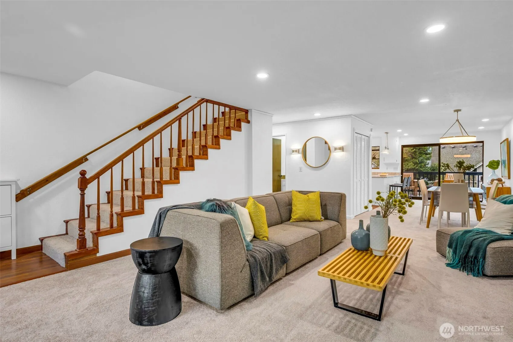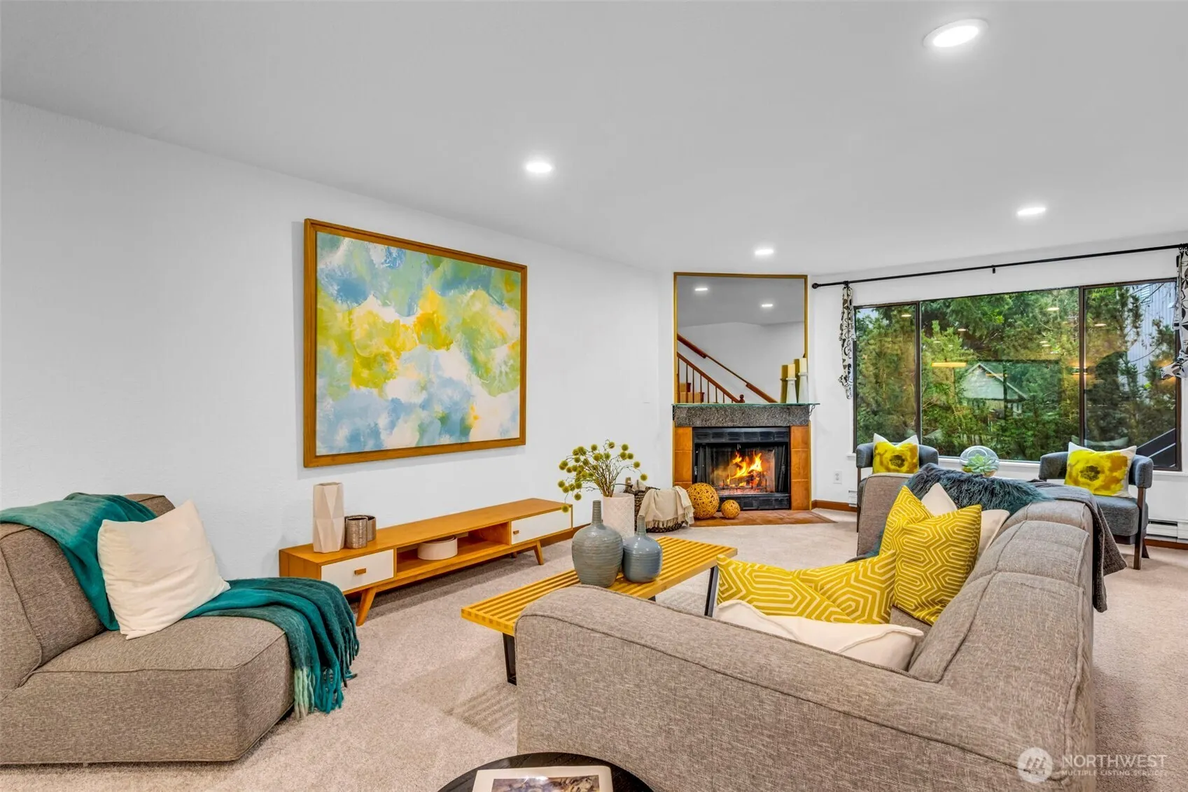 Tucked off N 175th—away from the traffic—this serene 3-level townhome-style condo offers the privacy of a single-family home in a peaceful, park-like setting surrounded by mature trees. With 1,728 sq ft of impeccably maintained, move-in-ready space, this is condo living without compromise. The open-concept main level welcomes you with a spacious living room and cozy wood-burning fireplace, dedicated dining area, powder room, and a beautifully remodeled kitchen featuring quartz countertops, custom tile work, and newer appliances. Fresh carpet on the main and lower levels adds warmth and comfort. Upstairs, the generous primary suite includes dual closets and an updated ensuite bath, plus a second bedroom and full guest bath. The versatile lower level offers a third bedroom or bonus family room with direct access to your private 2-car garage—an uncommon luxury in condo living. Step outside to a large deck overlooking tranquil green space—perfect for summer entertaining. Energy-efficient zone heating, newer hot water tank, and major exterior updates completed in 2023 (roof, paint, decks, parking lot) offer peace of mind. No current or upcoming assessments. Located on a quiet, landscaped lane in the award-winning Shoreline School District, just minutes to light rail, I-5, and everyday conveniences like Trader Joe’s. HOA covers water, sewer, garbage, and yard maintenance. Rare. Spacious. Effortless. Don’t miss it.