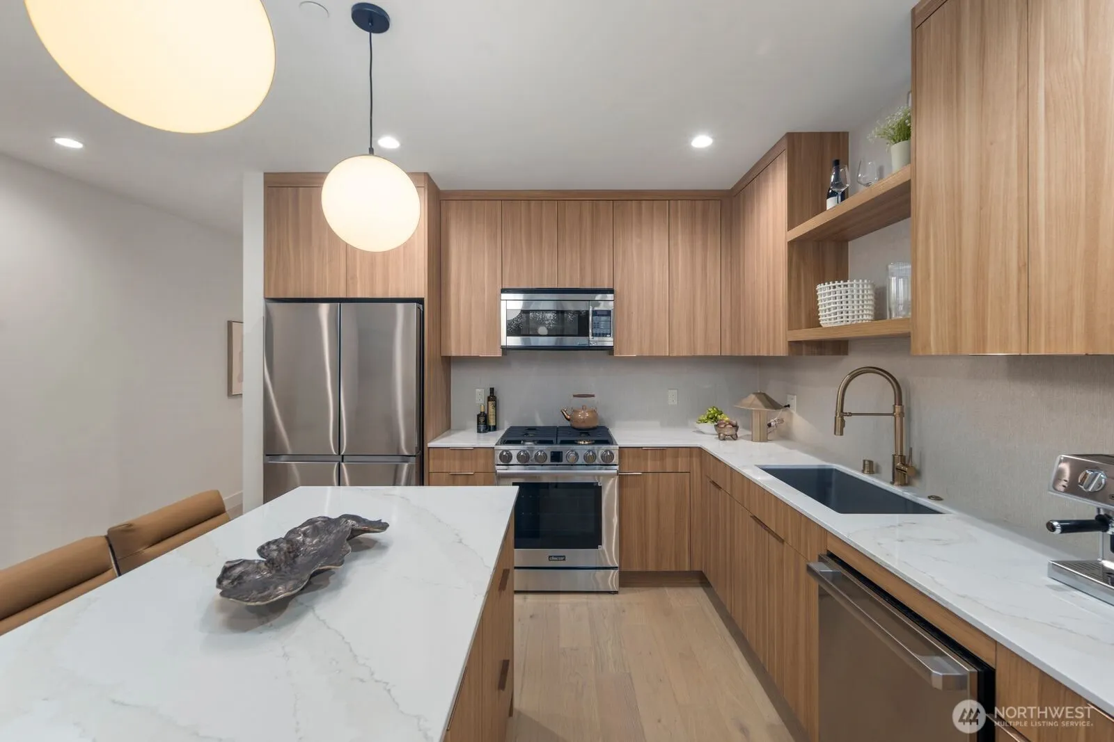 4.875% builder rate. Walkable urban Edmonds living at the hottest new construction project in the Bowl: Pine Park. Open plan w/ sleek modern kitchen: custom flat-panel cabinetry, Daltile Monte Lucia quartzite, island seats 3 w/ ample storage, open shelving. SS Dacor appl w/ 4-burner gas range. Walk-in pantry w/ built-ins. Guest bath on main. Heat pump mini-splits throughout for yr-round comfort. Deck extends living/entertaining. Details are on point; Luxe finishes throughout. Primary suite w/ Sound & Olympic views, WIC & ¾ bath. 2nd suite w/ full bath. W&D. View rooftop deck w/ hatch access. Lower-level flex space ideal for office/study. Wide-plank white oak hardwoods throughout. Deep 1-car garage for add’l storage or fitness space + driveway parking.