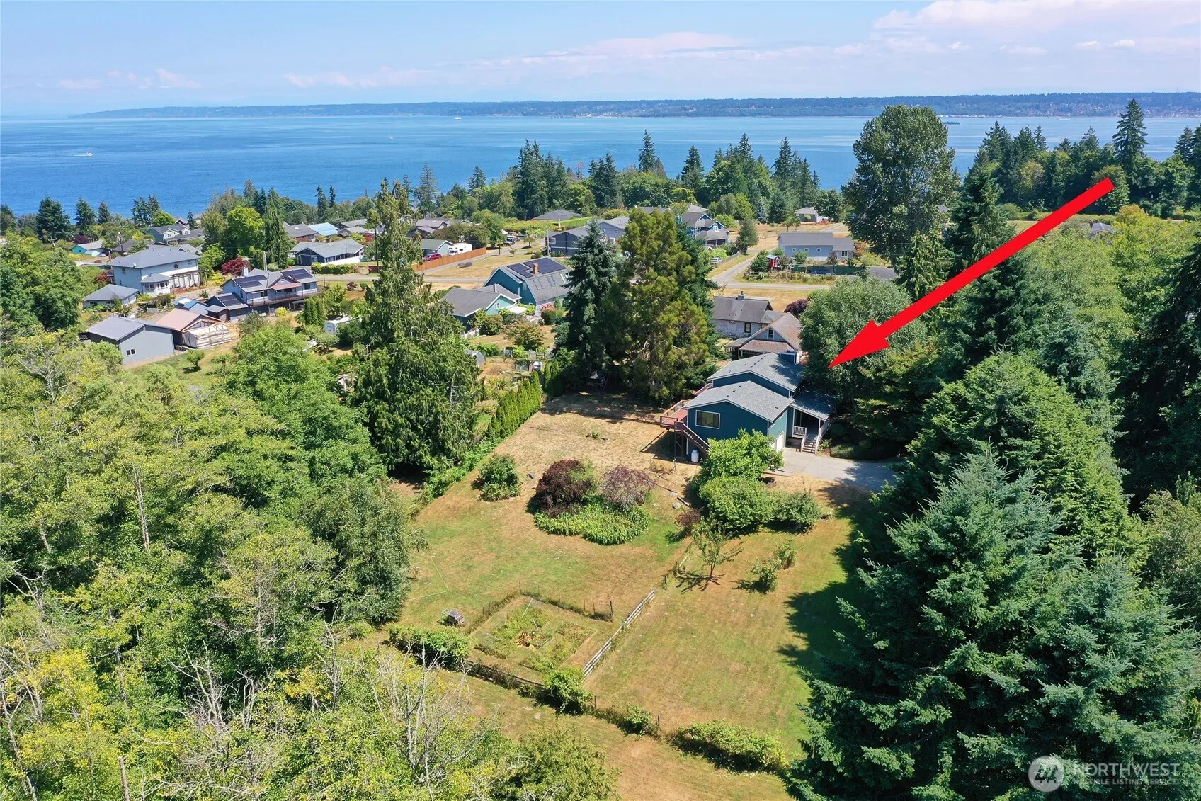 Wake up to peaceful sounds of the countryside, fresh air and peekaboo views of Puget Sound, just three miles from the Kingston ferry terminal. This charming farmhouse, sited high on nearly two sprawling, partially wooded acres, offers the perfect blend of idyllic rural living, modern comfort and privacy with easy commute to the city. The heart of the updated floor plan is its remodeled kitchen, a pleasant space for gathering and taking in the panoramic views. Brand new roof w/ transferable warranty, new exterior paint, an oversized garage with workshop area, and potential to construct an ADU invites creativity and added value. This package is waiting for your homestead dreams – your opportunity awaits!