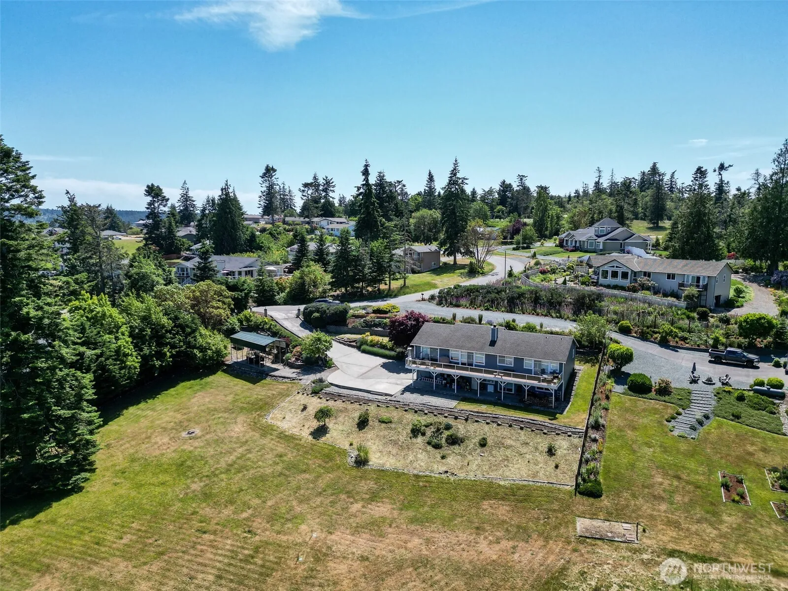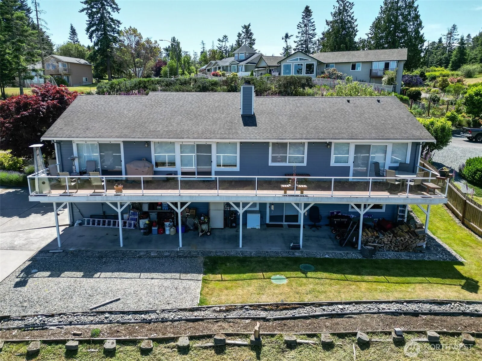 Enjoy stunning Mt Baker & the Puget Sound views from the full-length deck! Backing to 11+ acres of HOA land, you’ll enjoy rare privacy & the feel of wide-open space w/o the upkeep. Upstairs features, 2 beds, large home office, a full & ¾ bath, remodeled kitchen w/custom cabinets & new floors, great room, cozy wood-burning fireplace, built-in surround sound w/6 ceiling speakers. Built-in accent lighting adds warmth & charm throughout. The lower level with private no-stairs entry-ideal for multi-gen living or guest quarters-kitchenette, bedroom, living area, utility room, & ¾ bath. Easy-care landscaping w/fruit trees. This unique home blends stunning views, versatile living space in one of the area’s most desirable locations. You are home!