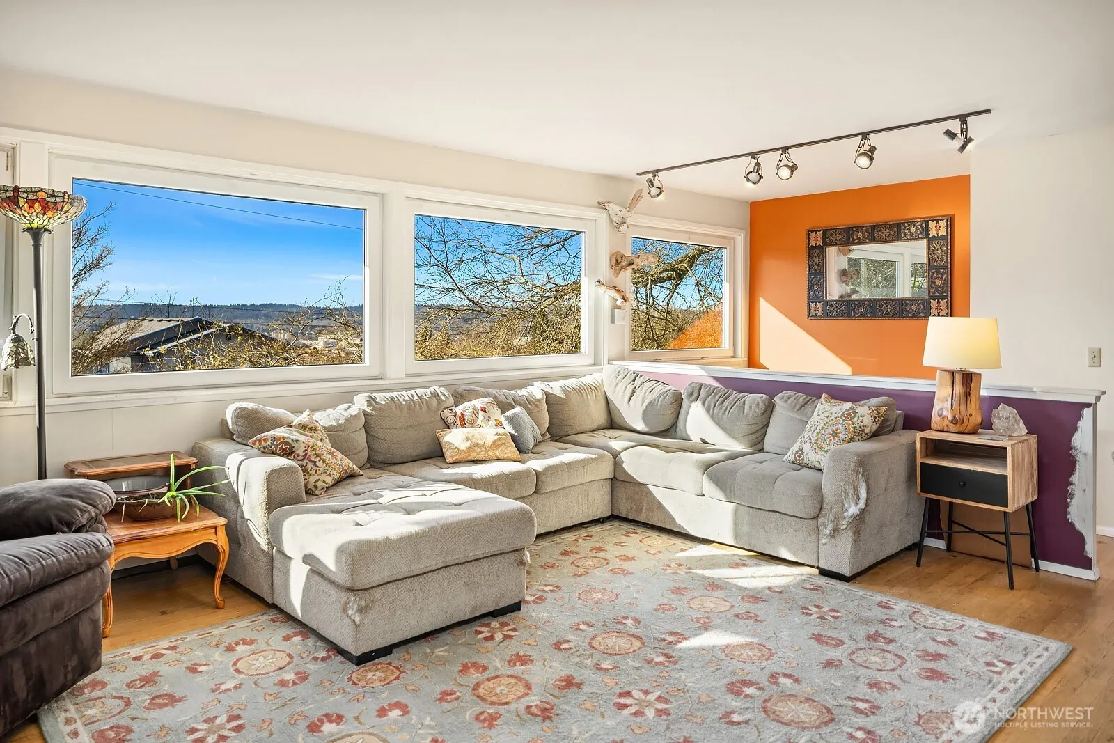 Welcome home! Tucked away in a quiet, close-knit community, this light-filled split-level offers a rare blend of design, flexibility, and long-term value. Expansive European windows span the upper level, flooding the home with natural light and framing sweeping territorial views. Multiple opening configurations and built-in electronic blinds make entertaining effortless year-round. The open-concept main level is anchored by a gourmet kitchen with island, perfect for hosting, while guests gather around the cozy wood-burning fireplace on crisp fall and winter evenings. Step through the European patio doors to a spacious backyard—ideal for summer barbecues, play, and outdoor living. Downstairs, soaring ceilings reveal a fully built-out ADU space featuring a bedroom, full bathroom, complete kitchen, living area, and fireplace—just awaiting a formal access point. Whether used for multi-generational living, guests, or rental income, the flexibility here is unbeatable. Add in a two-car garage for projects, storage, or even a home office, and the possibilities are endless! Perched on a bluff overlooking the city and mountain range, this home also delivers outstanding convenience with quick access to SR-167 and I-405. A compelling opportunity for both owner-occupants looking to plant roots and savvy investors alike—this is one you won’t want to miss!