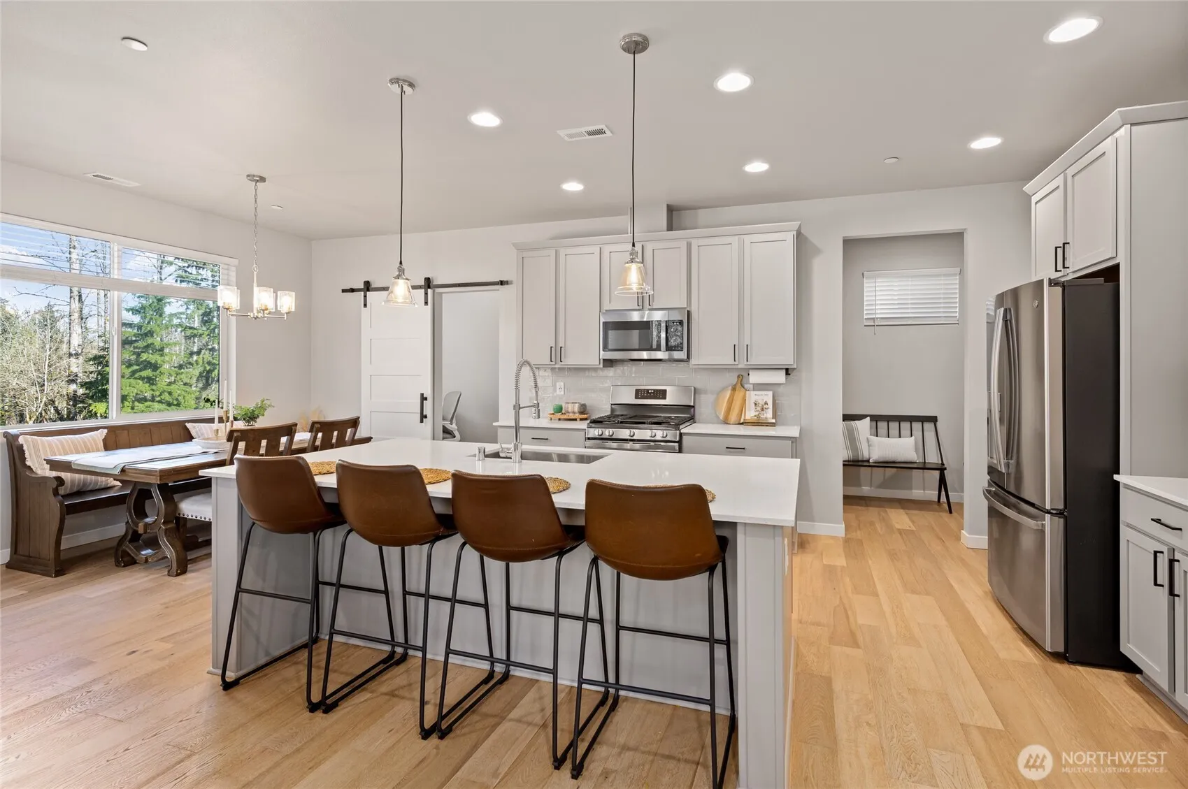 SIMPLY BEAUTIFUL modern style corner lot home in new condition overlooking a nicely landscaped Community park with Cascade Mountain and territorial views that provide relaxing scenery to enjoy. This spacious 5 bedroom, 3.5 bath home shines with natural light filling the home. Enjoy lounging on the main level family room with a gas fireplace next to a spacious cook’s kitchen w/quartz counters & island, SS appliances, lots of cabinets, walk-in pantry, dining area, and a convenient pocket office with barn door just off the kitchen. This 3265 sqft floorplan offers an upstairs loft area plus a lower level private suite for guests or entertaining with an oversized rec room, bedroom w/walk-in closet & full bath. The large primary bedroom upstairs will pamper you with “Two” walk-in closets, a Spa-style bathroom w/dual showerheads & soaking tub. The home also features AC/Heat pump for year-round comfort, Tankless water heater, W/D in upstairs laundry/utility room, elegant engineered hardwood, luxurious vinyl plank flooring, window blinds & screens, and Google Nest Yale doorbell and doorlock. The covered patio & deck overlook a fully fenced yard with gate. Close to shopping with quick access to Hwy 9 & I-5. This home is move-in ready!