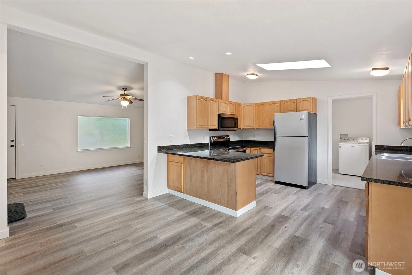 Beautifully updated rambler on a large, level, and private lot with incredible space and versatility. Recent upgrades include new flooring, fresh interior paint, a new range and oven, a new water heater, and a new garage door. The open-concept, skylight drenched kitchen shines with granite slab countertops and flows seamlessly into the living areas—perfect for entertaining. Enjoy both front and back decks, recently refinished, offering great outdoor living &entertainment spaces. An expansive garage can accommodate up to four vehicles and/or serve as a dream workshop, with additional outdoor parking ideal for RV or boat storage. A rare opportunity offering modern updates, privacy, and exceptional parking options.