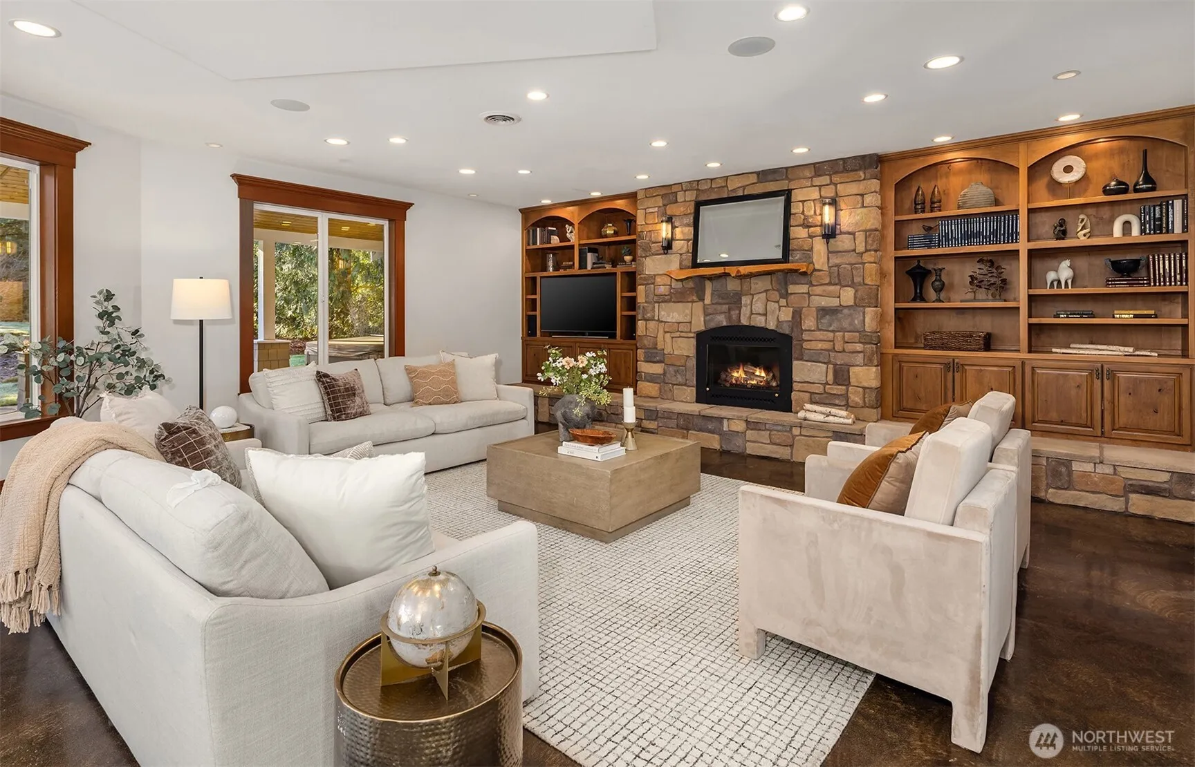 Multigenerational estate offering privacy, scale, and versatility on 5 wooded acres! Surrounded by forested trails and natural serenity, this 6,980 sq ft home is thoughtfully designed for refined, flexible living. The dramatic great room features soaring 2.5-story cathedral ceilings and floor-to-ceiling windows that flood the space with natural light. Radiant-heated concrete and engineered hardwood floors flow seamlessly into a chef’s kitchen with premium appliances and generous prep space. Upstairs, a bright open office loft overlooks the main living area, while a flex media room with projector offers space for movie nights or casual entertaining. The primary suite is a true retreat with a covered private balcony, sitting area with fireplace, spa-inspired heated bath, boutique-style walk-in closet, and private laundry. An expansive attached west wing provides exceptional multigenerational flexibility, featuring a second full kitchen, additional bedrooms, and a spacious entertainment area ideal for extended living or guests. A fully finished fitness room with glass exposure off the back porch creates an inviting indoor-outdoor feel. Outside, enjoy five usable acres with a covered patio, hot tub, gas and wood-burning fireplaces, custom chipping green, built-in sand pit, and ample space to gather or unwind. Peaceful rural living with easy I-90 access, approximately 20 minutes to Eastside light rail, and top-rated Snoqualmie Valley schools—where privacy meets connectivity.