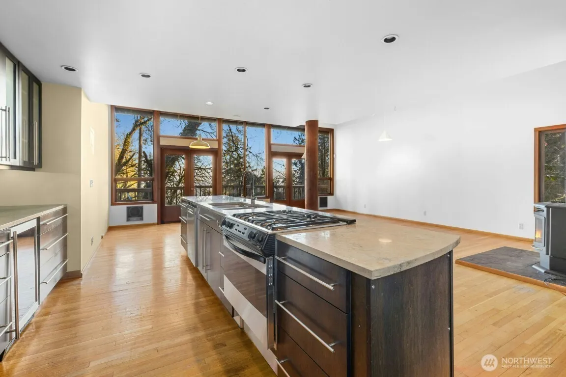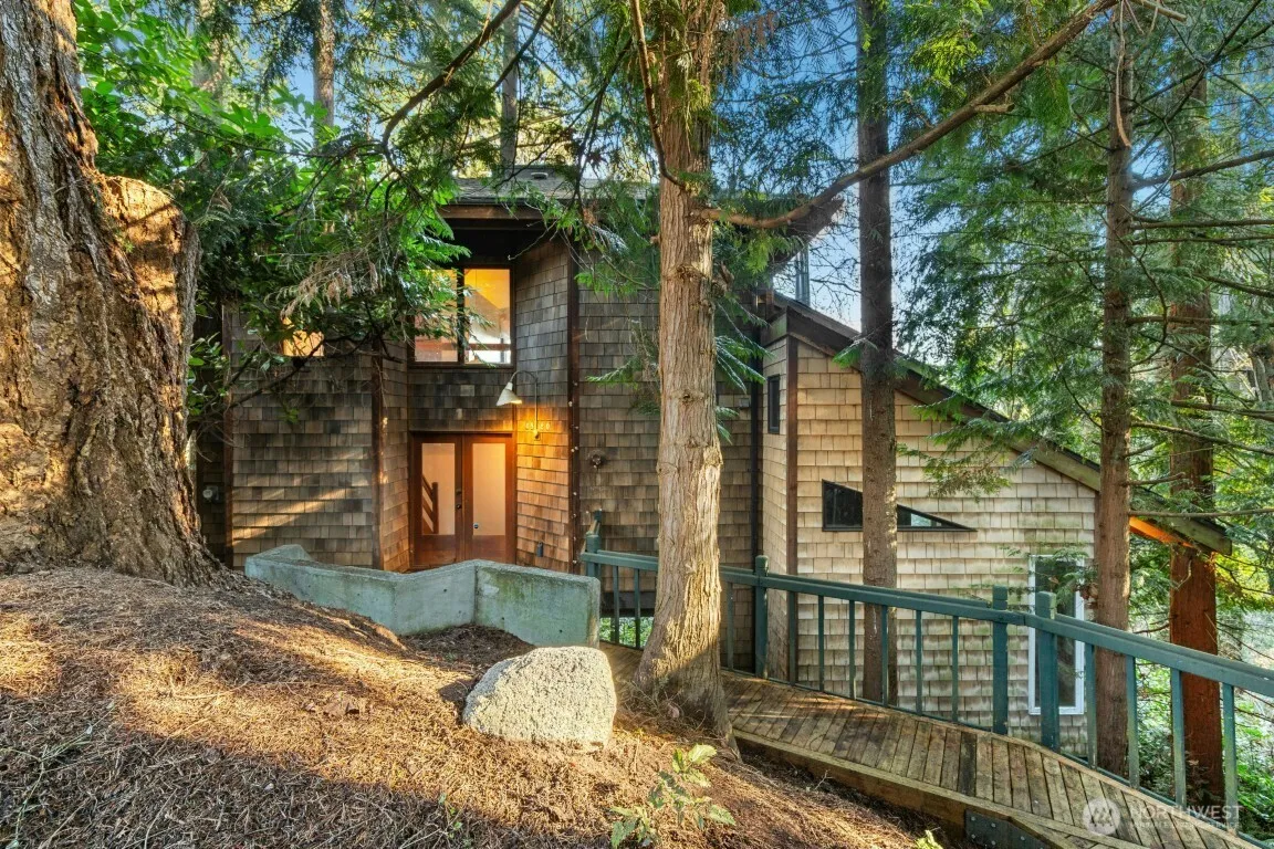 Avail Now! This 2 bed + loft style, 1.75 baths, 1790asf Mercer Island Home makes you feel like you are living in the woods while being minutes away from amenities. The steps to the home lead you through a tree covered path & across a wooden walkway to the entry. The home opens to a two-story entry with slate floors leading into the open living space. The updated galley styled kitchen with stainless appliances, gas cooktop, wine fridge & stone counters opens to the two-story living and dining room. A gas fireplace adds warmth to the space with an abundance of natural lighting through the large windows & skylights. A .75 bathroom off the living space is usable by both the main floor bedroom which has a walk-in closet & deck to take in the views and a secondary bedroom that steps down a level just off the living room. The laundry is just off the bathroom with full size washer and dryer. The upper level of the home is a loft style bedroom that is open to lower level. The vaulted ceilings in this space center with a skylight. Windows can open to the living space below or can be kept closed to create a sense of privacy. The primary bathroom has open ceilings with a large shower & separate toilet room. A walk-in closet with built ins allows for storage. A foyer area between the loft area & door to garage create a space for entering the home. Two-car garage attached. A truly unique home that is a must see to appreciate. Home sits on cul-de-sac, just minutes to I-90 and amenities.