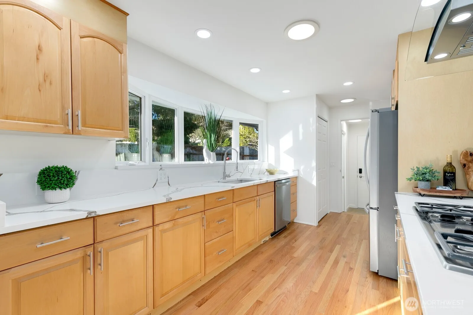 Enjoy this West Bellevue home that offers privacy, abundance of natural light & flexible floorplan. 3 bed 1.5 bath upstairs with upstairs laundry. Lower level offers 1 bed + den (could be 5th bed?), Full kitchen, laundry & living room with separate entrance option. Perfect for Multigenerational living or rental? Thoughtfully renovated with an upgraded kitchen & bath, fresh paint inside & out, gleaming refinished hardwoods upstairs, new carpet & LVP downstairs. Numerous other updates make this home move-in ready. An expansive deck surrounded by lush landscaping that backs to park! Steps away from NW Arts Center, Clyde Hill Elem, parks & DT Bellevue within mins—this home is a rare find that offers comfort, convenience, privacy, & future upside. Lots of off-street parking, wired for generator. Hurry on this one!