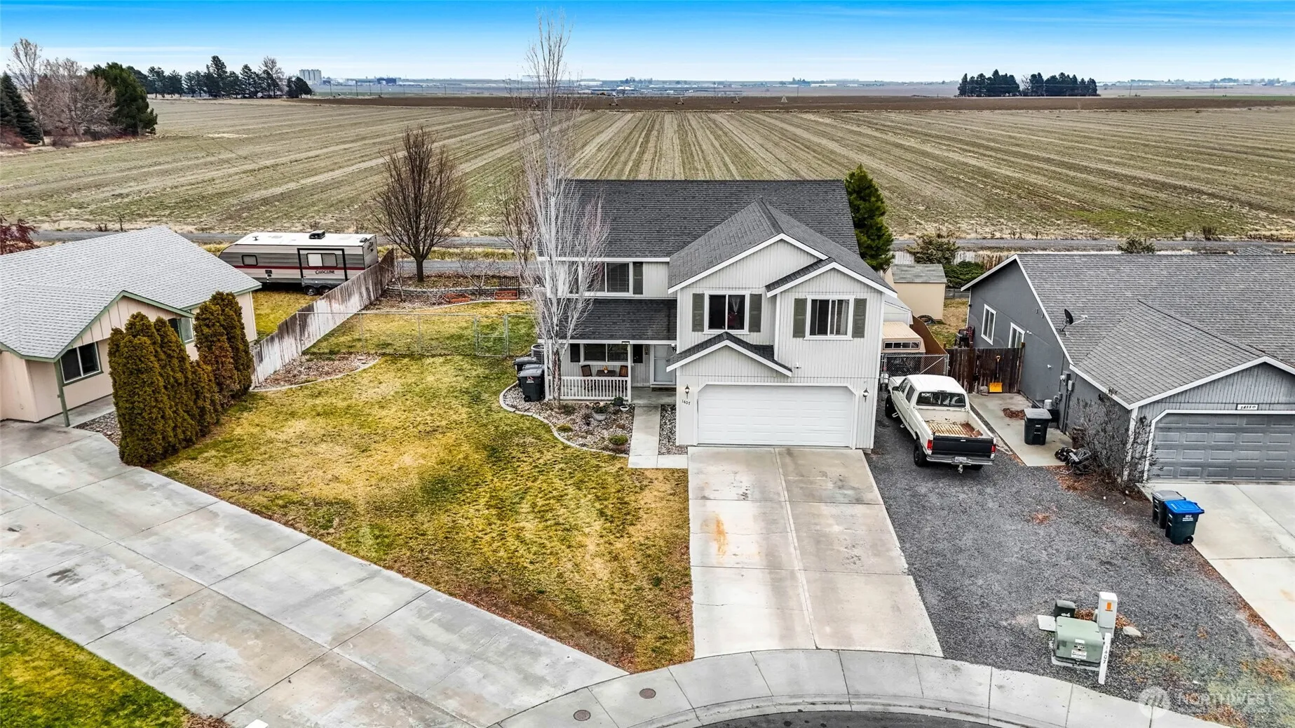 You’ll love the space, comfort, and flexibility this beautifully updated home offers. The unique floor plan features five bedrooms upstairs, plus a main-level office ideal for remote work, homeschooling, or guests. The heart of the home is the stunning kitchen, showcasing stylish white cabinetry, abundant storage, a pantry, quartz countertops, and a large island with seating—perfect for busy cooks and large gatherings. The main level is finished with durable, waterproof vinyl plank flooring, designed to stand up to everyday living. Retreat to the spacious primary suite with a private bath and a big walk-in closet complete with a custom organization system. Outdoors, enjoy a low-traffic cul-de-sac location with no rear neighbors and open farmland behind the home, offering peaceful views and beautiful sunrises. The fully fenced yard includes underground sprinklers, a storage shed, RV parking, a large garden with timed irrigation, and established fruit trees and berry bushes—ideal for outdoor enjoyment. A newer energy-efficient heat pump ensures year-round comfort indoors, while the insulated garage with extensive shelving is perfect for hobbies and storage. Conveniently located near local employers with easy access to schools, this one-of-a-kind home offers the space, functionality, and setting today’s buyers are searching for. Don’t miss this rare opportunity!