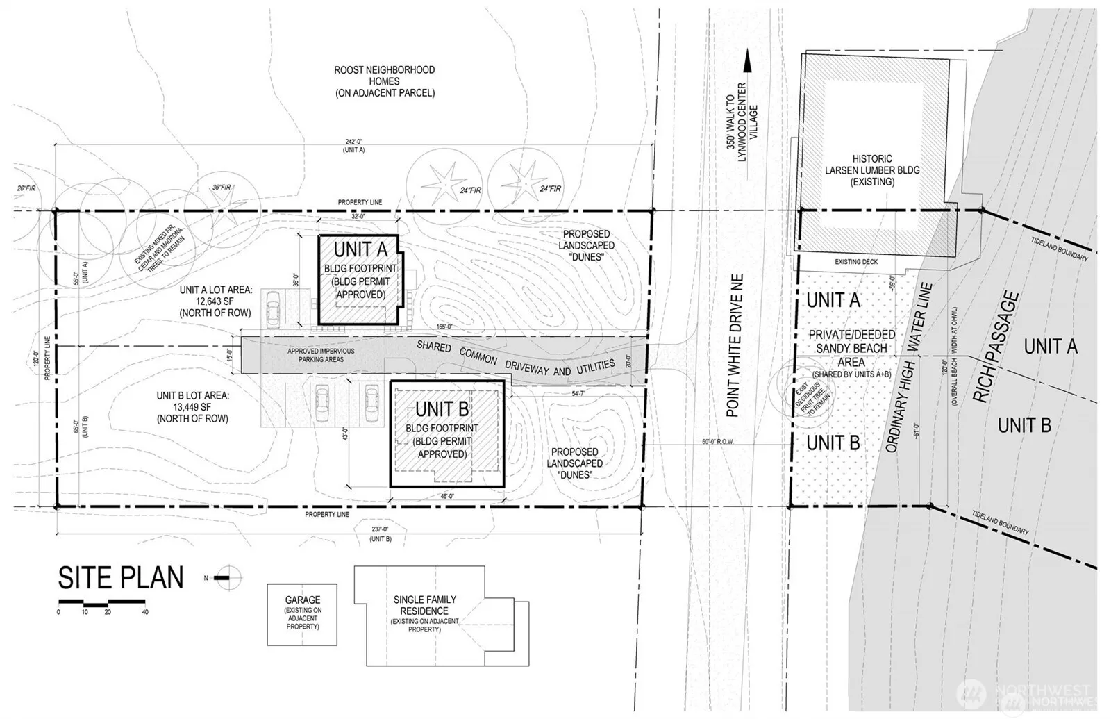 Unique building opportunity near Lynwood Center. This private waterfront, no-bank, sandy beach offering consists of Lot A + Lot B – airspace condo lots that were previously owned separately. Lot A has active permit for a 900sf unit, Lot B has an active permit for primary residence. Permitted plans included in the list price. Build as designed, or submit for a permit revision to construct your own design within the approved building sites. Close to restaurants, shops, parks, and the extensive Gazzam Lake Trail Network. Don’t miss out on this opportunity to build your dreams and be part of all that Lynwood Center and Pleasant Beach Village have to offer!