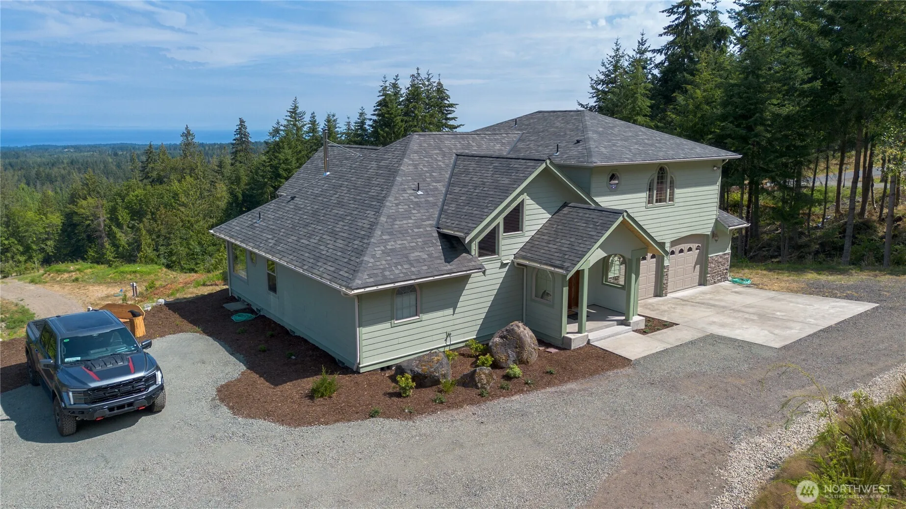 Want unstoppable water and mountain views with 5.39 acres of privacy and a stunning NW contemporary home? Enjoy some of the most amazing views available in the Port Angeles area, from every room. Mt Baker Klahhane, Ridge, Victoria & San Juans. This Maletti Hill community offers along with the view, a gated access, and paved road. Immaculate open floor plan with master bedroom on the main floor. Vaulted wood ceilings, upper and lower covered decks, spacious garage and additional poured slab for future structure or additional parking. Site prep and access just completed for possible ADU. Exercise program? Gotcha covered with established walking trails. Granite counters, tile shower and whirlpool bath. To much more to list!