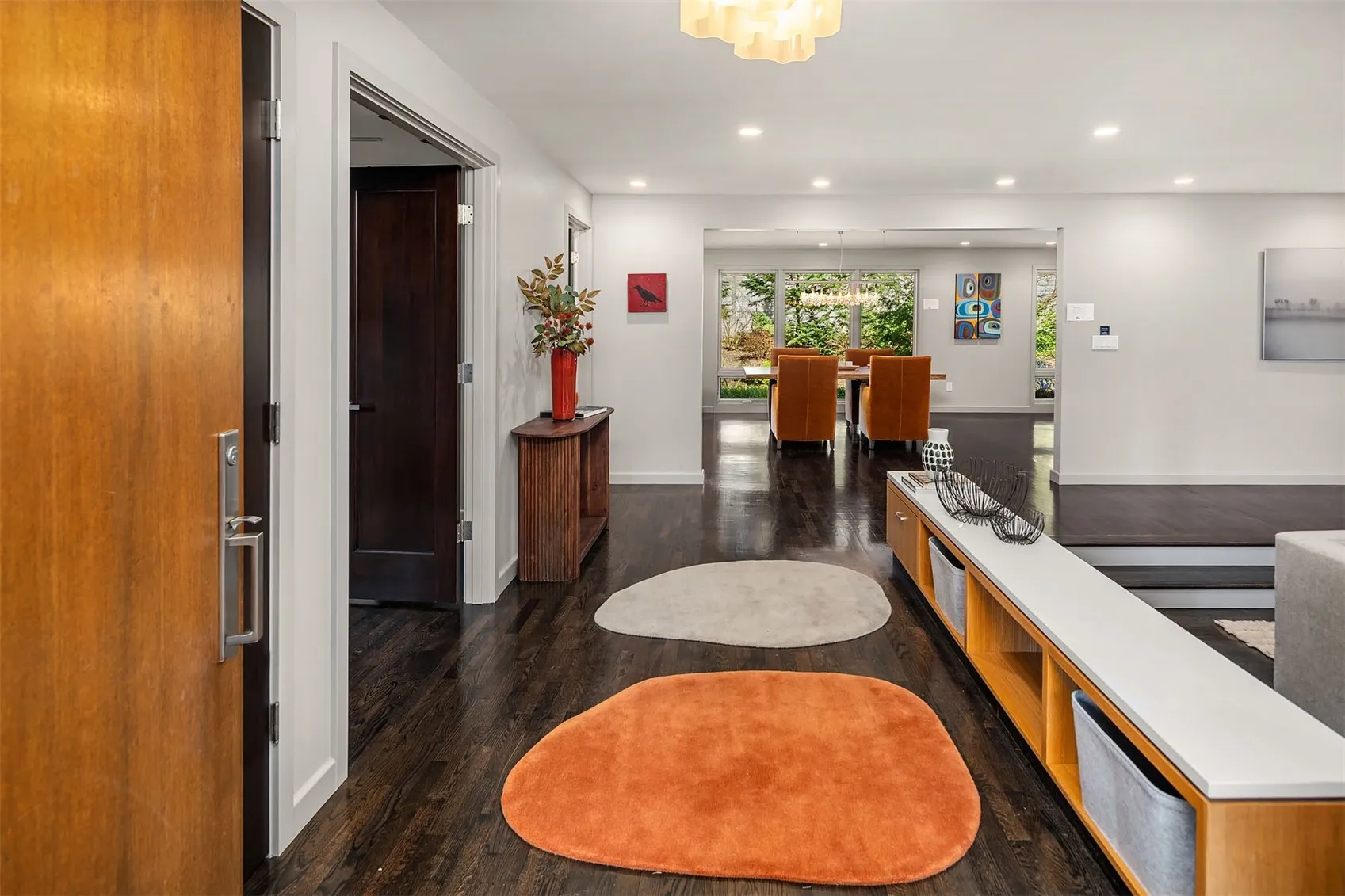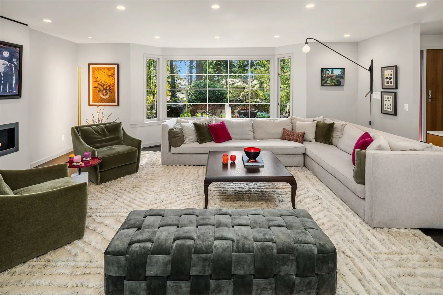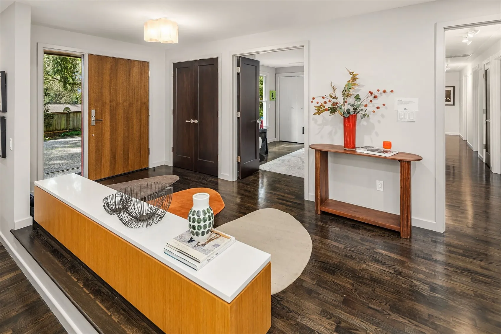 Exciting Price Improvement! Expansive One-story living offers 4 Bdrms + Den/Office is sited on a private lane, a home that lives as beautifully as it looks. Mid-century modern with a twist was redesigned for comfort & entertaining. Light & airy interior welcomes you to a generous size living room, modern fireplace & garden views. Clean lines compliment the Chef’s kitchen: white oak cabinets, lighted stainless steel floating shelves, stone surfaces, Wolf cooktop, Liebherr fridge & large island with seating for four. Extensive hardwoods throughout. Oversized family room + cozy dining room merges with the kitchen, highlighted by a wall of windows overlooking the private backyard, bringing the outdoors in. Flexible office/5th bdrm with closet. Primary suite with floor-to-ceiling windows, remote control blinds & stylish bath renovation (2024) features Ann Sacks tile, skylights, heated floors & custom closet with built-in dressers. Beautifully remodeled full bath with custom cabinets, floating vanity, modern soaking tub & heated floors. Serene, fully fenced backyard has expansive patio, firepit, mature landscaping & irrigation in front and backyard + Dog run/chicken coop. Metal 50 yr. roof (2024), New exterior paint (2023), Lutron lighting systems (2024), 2 gas furnaces & new water heater (2023) w/ recirculating pump. Oversized 2 car garage. Steps to Lakeridge Elementary & Islander Middle.