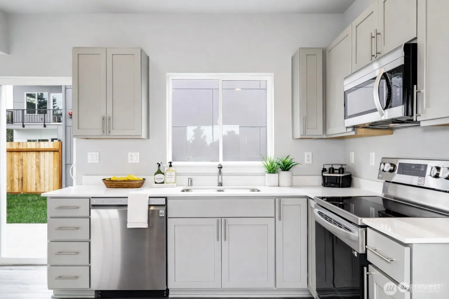 Exquisite, sun-filled home in the highly desirable Chelsea Park neighborhood of Burien. Thoughtfully designed with vaulted ceilings, expansive windows, and clean modern lines, this residence offers bright, open living spaces that feel both welcoming and refined. The main level showcases a stylish living room, a convenient powder room, and a sleek eat-in kitchen that flows seamlessly to a sliding door and fully fenced yard—perfect for entertaining and everyday living. Upstairs features two generously sized bedrooms, a well-appointed ¾ bath, and a private deck overlooking Chelsea Park, creating a peaceful retreat. Additional highlights include an attached garage and air conditioning for year-round comfort. Ideally located directly across from Chelsea Park and just minutes from beaches, parks, Olde Burien’s shops and restaurants, and easy freeway access—this home delivers modern living at its best.