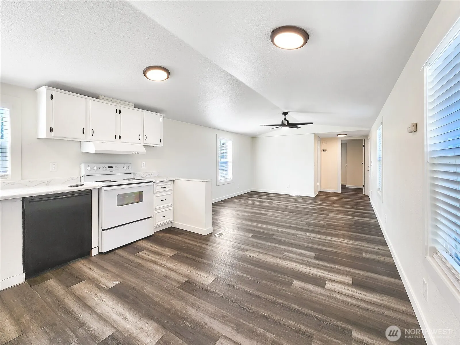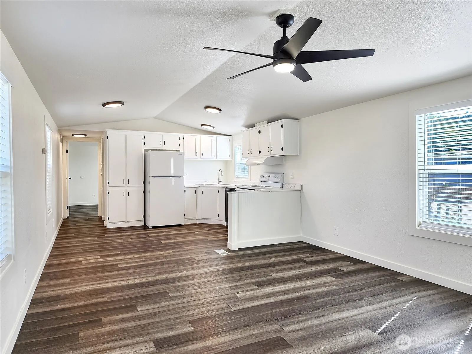 Bright, fresh, and move-in ready! This updated single-wide manufactured home offers 2 bedrooms and 2 full baths, featuring modern light tones and an open feel throughout. Enjoy cooking in the stylish kitchen with included appliances—stove, fridge, and dishwasher. New light fixtures add a contemporary touch, and the spacious primary suite includes a walk-in closet and full bath. The functional laundry room opens to the outdoors, adding everyday convenience. A great opportunity for affordable, stylish living—schedule your tour today!