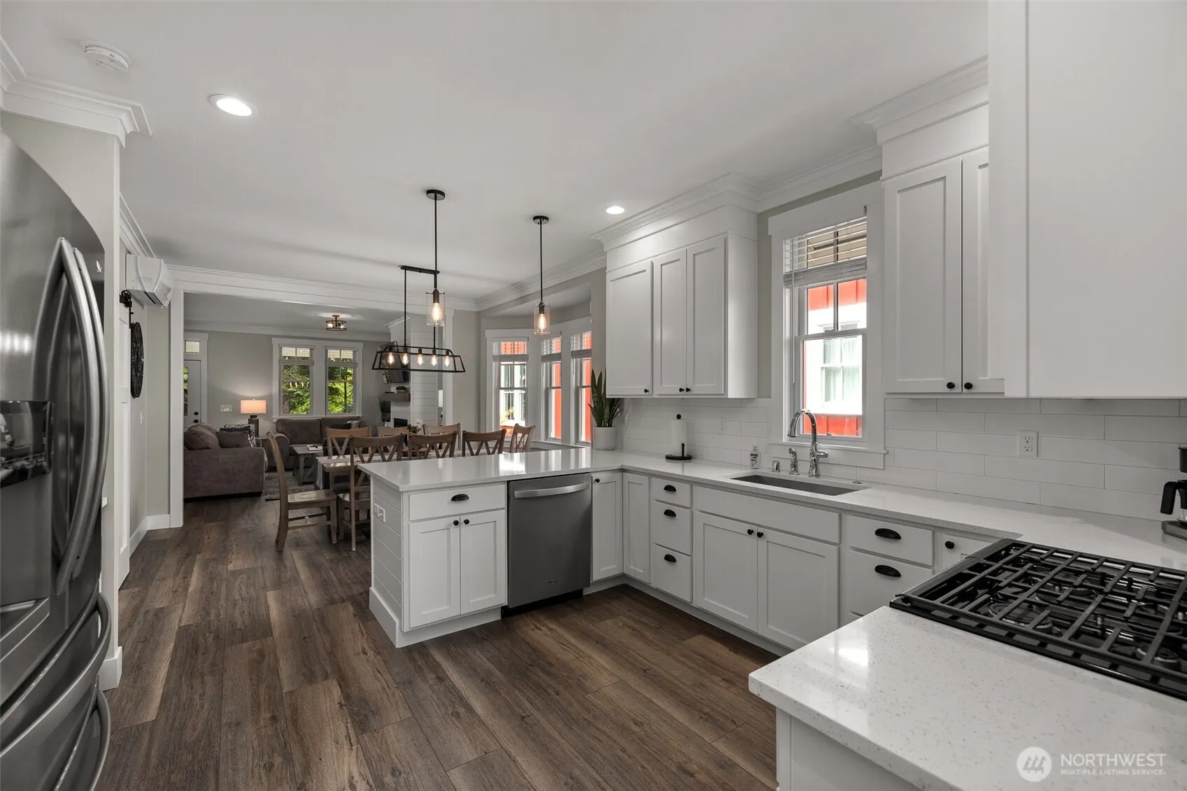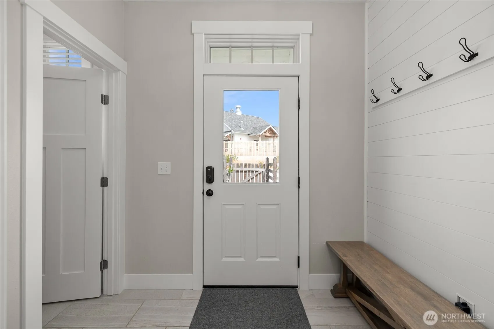 This light-filled, open-concept home is designed for seamless living. The common area features a cozy living room with a gas fireplace and classic shiplap accents, providing warmth and ambiance. Quality finishes throughout include elegant crown molding. The kitchen has pearl quartz countertops, stainless steel appliances, full subway tile backsplash, ample cabinetry, and a large central island for prep and serving. The layout includes three bedrooms. The spacious primary suite features an en suite bathroom with high-end fixtures. A sliding barn door adds privacy between the main living area and the guest suite, which includes two bright bedroooms and a beautifully finished shared full bathroom. A dedicated mudroom offers a durable floor and built-in storage, strategically located for easy entry and shedding outdoor gear after exploring nearby trails. The location is unparalleled, directly across from the community pool and fitness center. The extensive Seabrook trail system is easily accessible from the back of the property for biking, running, or walking. Outdoor living is a pleasure with a charming, covered front porch and a private, fully fenced yard. The yard includes a luxurious hot tub for unwinding and a storage shed. Ample on-site parking is also provided. Experience the best of coastal living in this perfectly positioned Seabrook home.