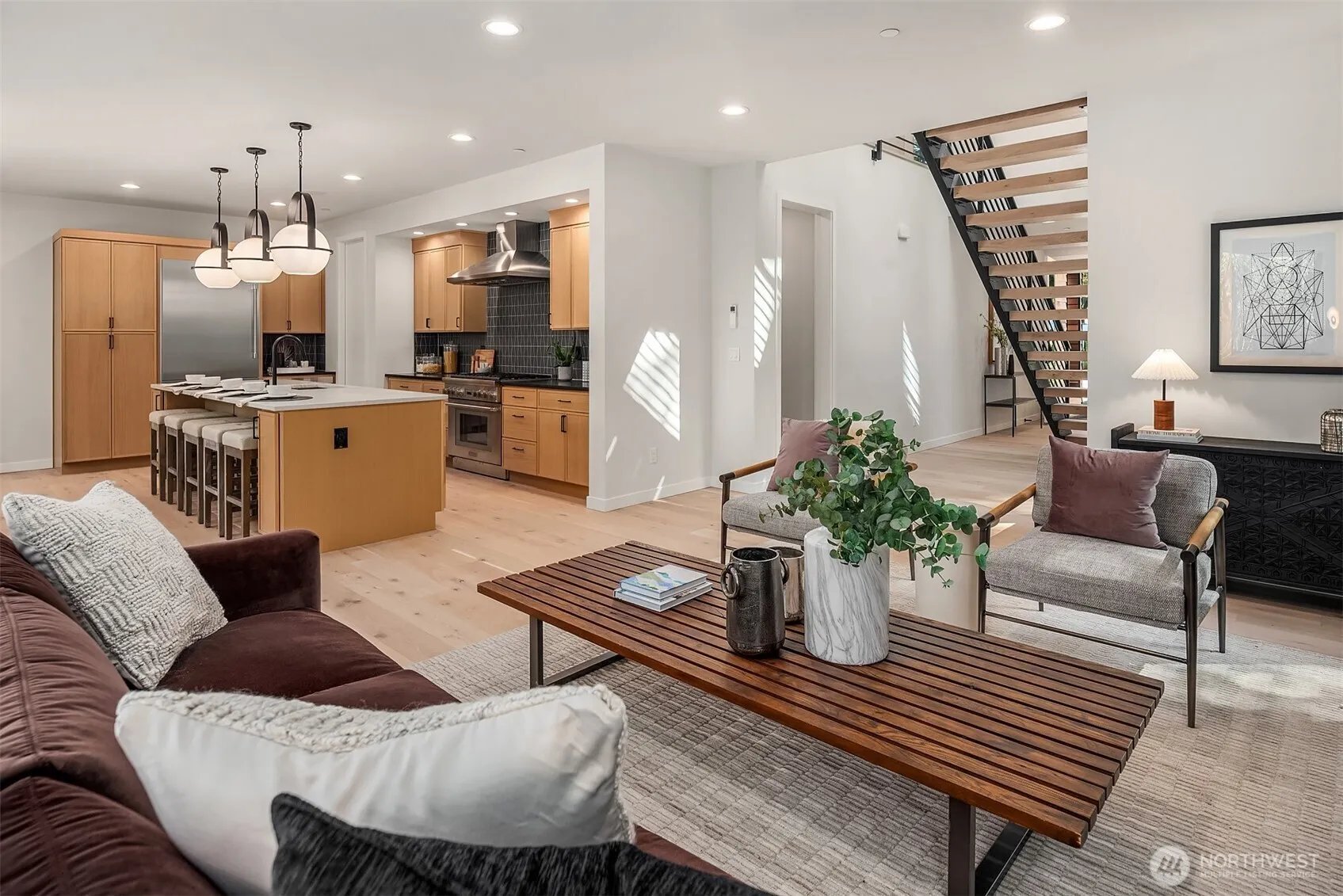 Modern masterpiece, privately tucked away in the heart of Kirkland. Just a short drive or walk to the Totem Lake Shopping area. Thoughtful NW Contemporary design includes a fully fenced yard, floating stairs, and a spacious bonus room. Enjoy outdoor heaters, built-in Monitor Audio speakers, and designer lighting throughout. Gourmet Thermador kitchen with Smart fridge and gas range. Covered composite deck with heaters for year-round use. Spa-inspired primary suite with heated floors plus dual washer/dryers for added convenience. A rare offering from one of the PNW’s premier builders.
