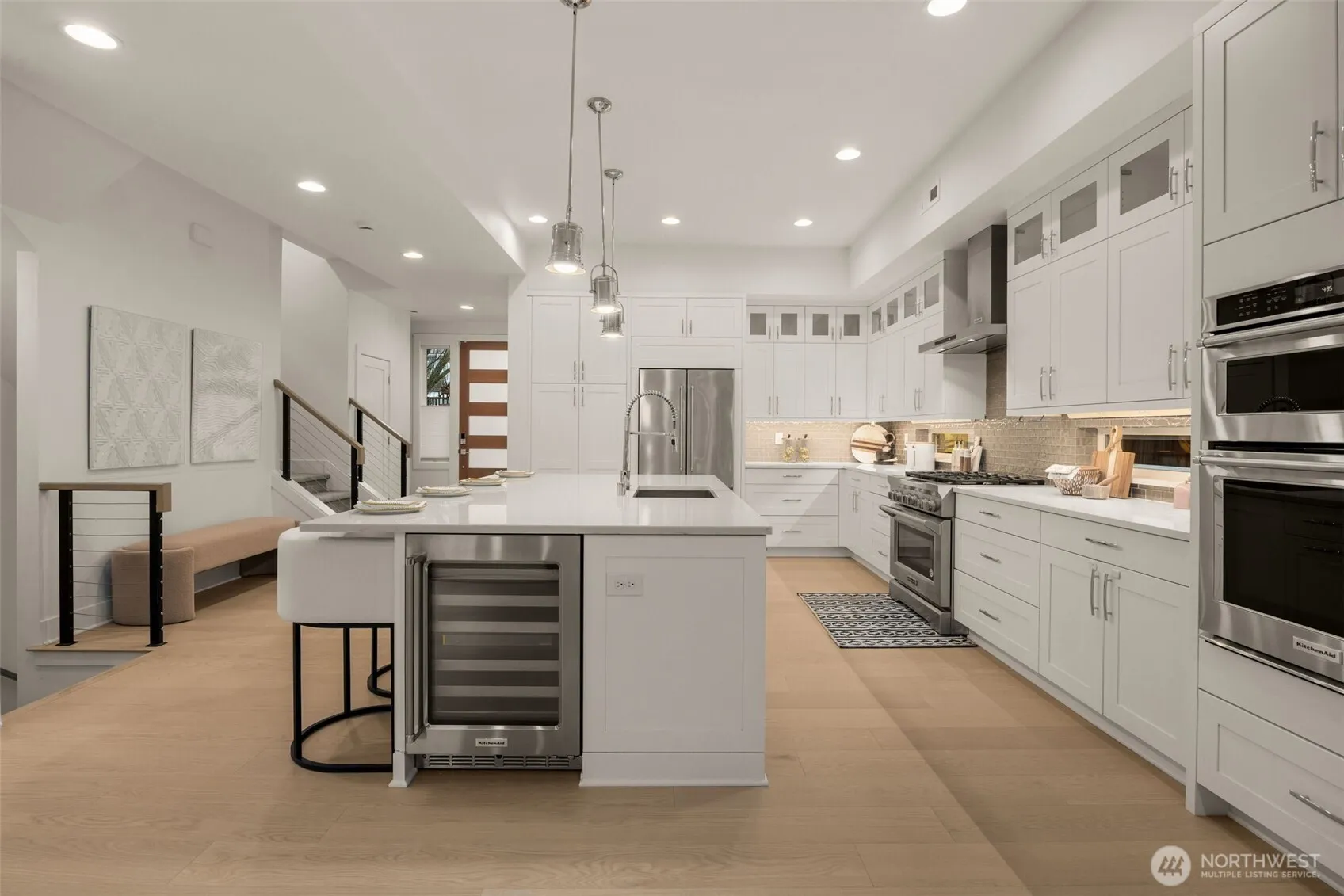 Experience the best of Downtown Kirkland living just steps from Google, Urban, QFC, restaurants, shops, & waterfront of Lake Washington. This stunning 4-bedroom, 3.25-bath detached 3-story home perfectly blends modern urban style w/ suburban comfort & features a private rooftop deck w/ breathtaking Lake Washington views — ideal for entertaining or unwinding at sunset. The thoughtfully designed interior showcases a gourmet kitchen w/ quartz countertops, premium KitchenAid appliances, fresh interior paint, & brand-new engineered hardwood floors. A well-managed HOA w/ dues covering water/sewer, the master insurance policy(including earthquake insurance), exterior repaint, fence replacement & more. Award-winning Lake Washington SD Schools! Free 1-year home warranty.