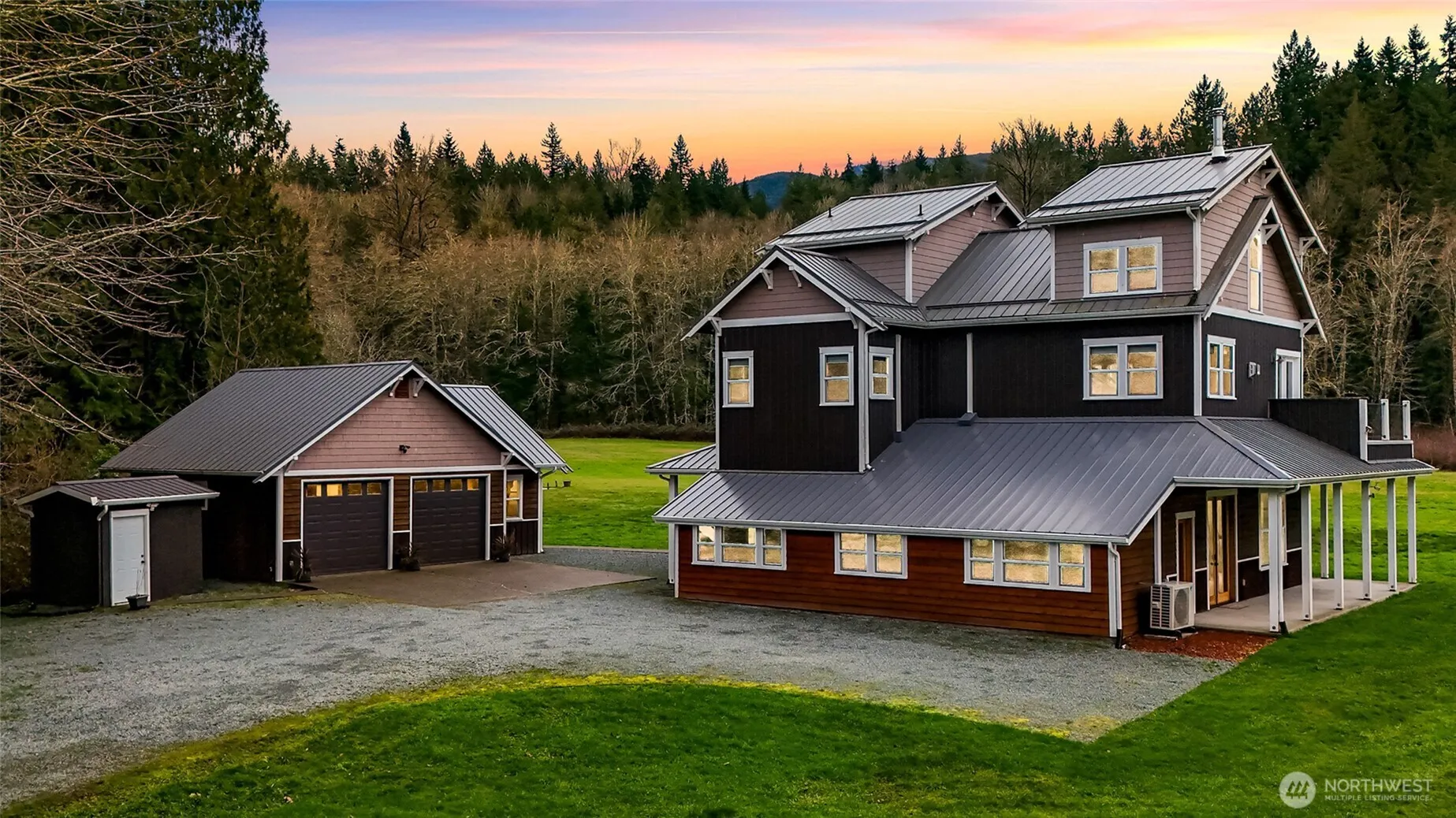 Private 14-acre estate w/ detached guest house, massive shop & incredible mountain views. Ideal setup for multigenerational living, rental potential, caretaker housing or private guest retreat. Tucked at the end of a long private driveway, this Skagit Valley acreage property offers privacy, open space, & incredible versatility. Flat usable land, ATV trails, expansive lawns, & mature trees create a peaceful setting w/ room for animals, hobbies, or recreation. Fruit trees including apple, cherry, & pear add beauty to the landscape. Main home, fully renovated in 2010, welcomes you w/a wraparound porch, inviting great rm w/wood-burning stove & beautifully updated kitchen. Upstairs features 2nd living space w/exposed beams, vaulted ceilings, maple floors & wet bar. Fully renovated detached guest house w/private driveway offers ADU/DADU potential & flexibility for rental income, Airbnb, multigenerational living, or guest accommodations. Ideal for multigenerational living or extended guest space. The property also features an oversized finished garage w/bathrm & workshop plus a massive detached shop, perfect for hobbies, equipment storage, home-based business, or creative studio space. An artist’s retreat overlooking the creek, new fire pit patio, generator wiring, & extensive upgrades add even more possibilities. With multiple structures & expansive land, this rare property offers potential as an event space, retreat property, equestrian, or estate w/ rental income opportunities.