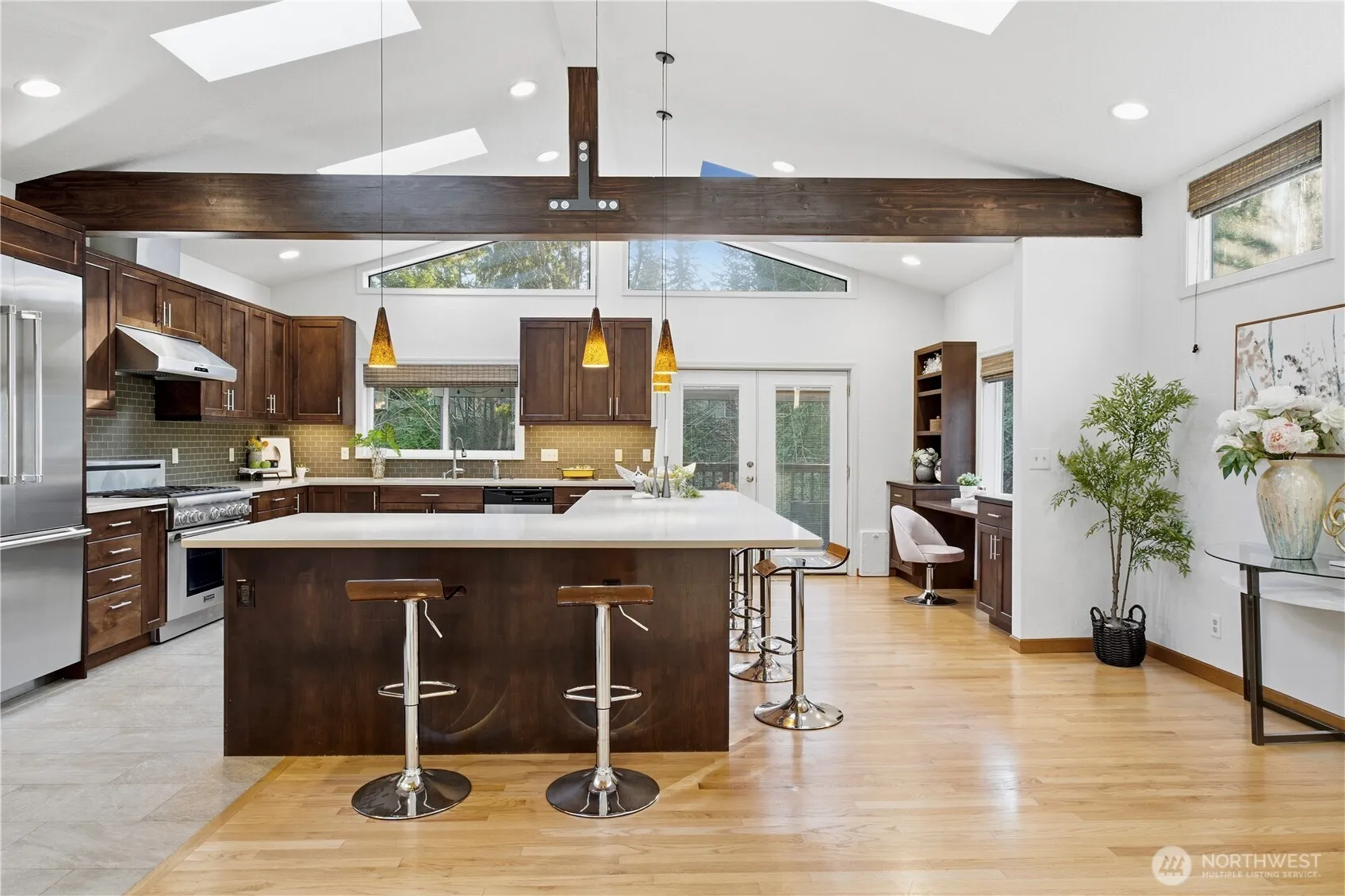 Expansive 5-bedroom, 2.75-bath home in Kirkland’s sought-after Finn Hill neighborhood, offering 3,140 sq ft of flexible living space on a generous 8,892 sq ft lot. Equipped with central A/C for year-round comfort, the main level showcases soaring vaulted ceilings and an inviting open layout anchored by a well-appointed chef’s kitchen featuring Thermador appliances and a massive island with seating for ten. The lower level is a standout feature, offering a separate entrance that creates a truly independent living quarter. This versatile space includes a full second kitchen, living room, and dining area. With a laundry room on each floor, this home is perfectly designed for multi-generational living, a private guest suite, or potential rental income. The private, fully fenced backyard serves as a peaceful retreat with two decks, a stone patio, a hot tub, and a fire pit. Situated in the top-rated Lake Washington School District, this home is conveniently close to highways, restaurants, and shopping centers, while remaining just minutes from the hiking trails at Big Finn Hill Park and Saint Edward State Park.