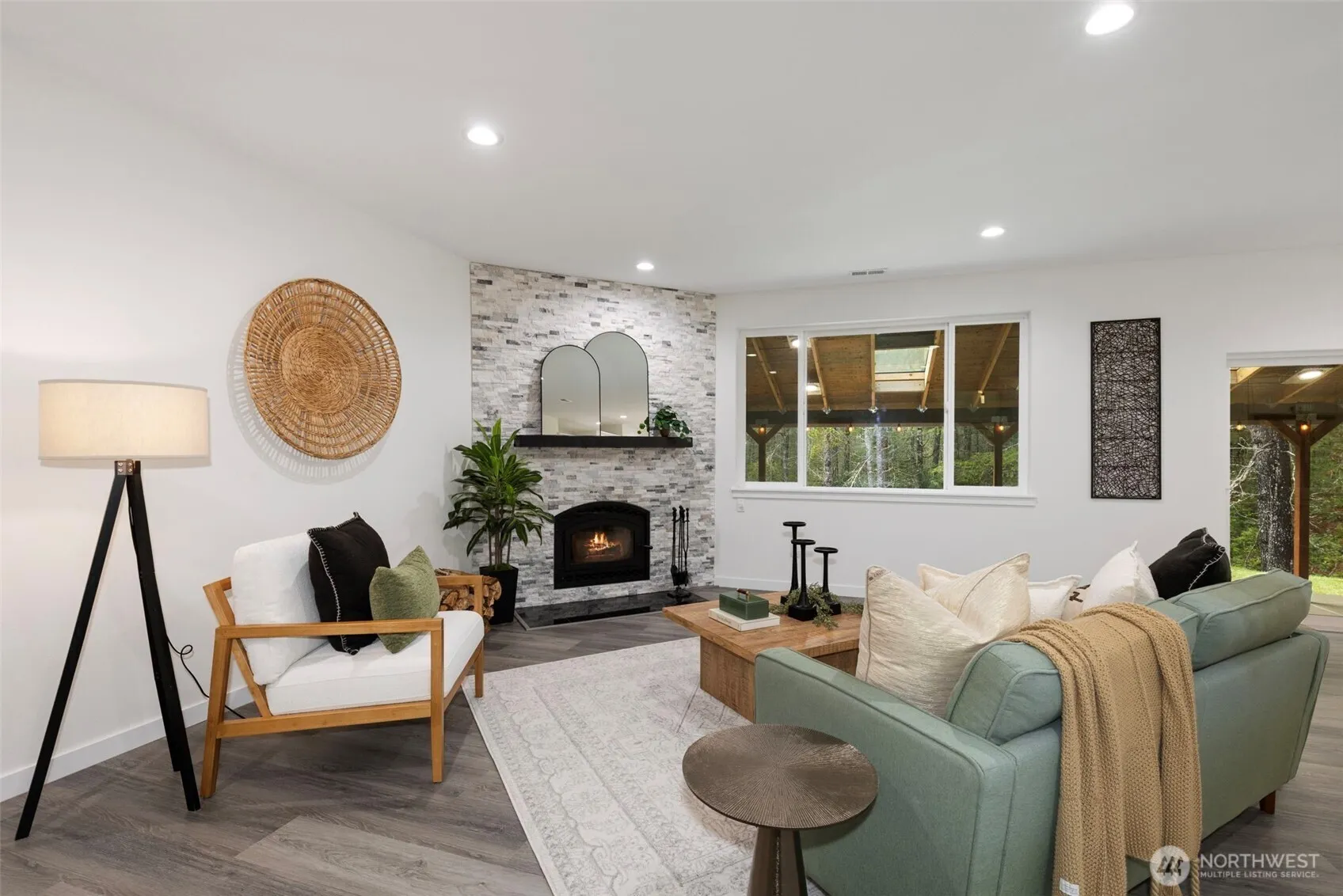 Custom-built in 2023, this stunning home sits on 5 private acres and blends NW Contemporary design with timeless comfort. The open-concept kitchen and living room feature a cozy wood-burning fireplace and seamless flow for everyday living and entertaining. A true chef’s kitchen offers quartz countertops, a large island, and three ovens—perfect for hosting and holiday gatherings. The main floor features durable LVP flooring throughout, a spacious primary suite, plus a second main-level bedroom with its own ensuite bath. A formal dining room adds flexibility for entertaining or special occasions. Upstairs, a generous rec room is plumbed for a wet bar, creating the ideal space for movie nights or game days. There are two additional guest bedrooms and a full bath upstairs. Step outside to the oversized covered back porch and relax in the hot tub while enjoying the peaceful acreage. Additional highlights include a 2-car garage with extra storage, space for a future shop, and permanent trim lights for holiday decorating ease! A whole-house Generac generator is also included. A rare opportunity to own a nearly new custom home with room to breathe.