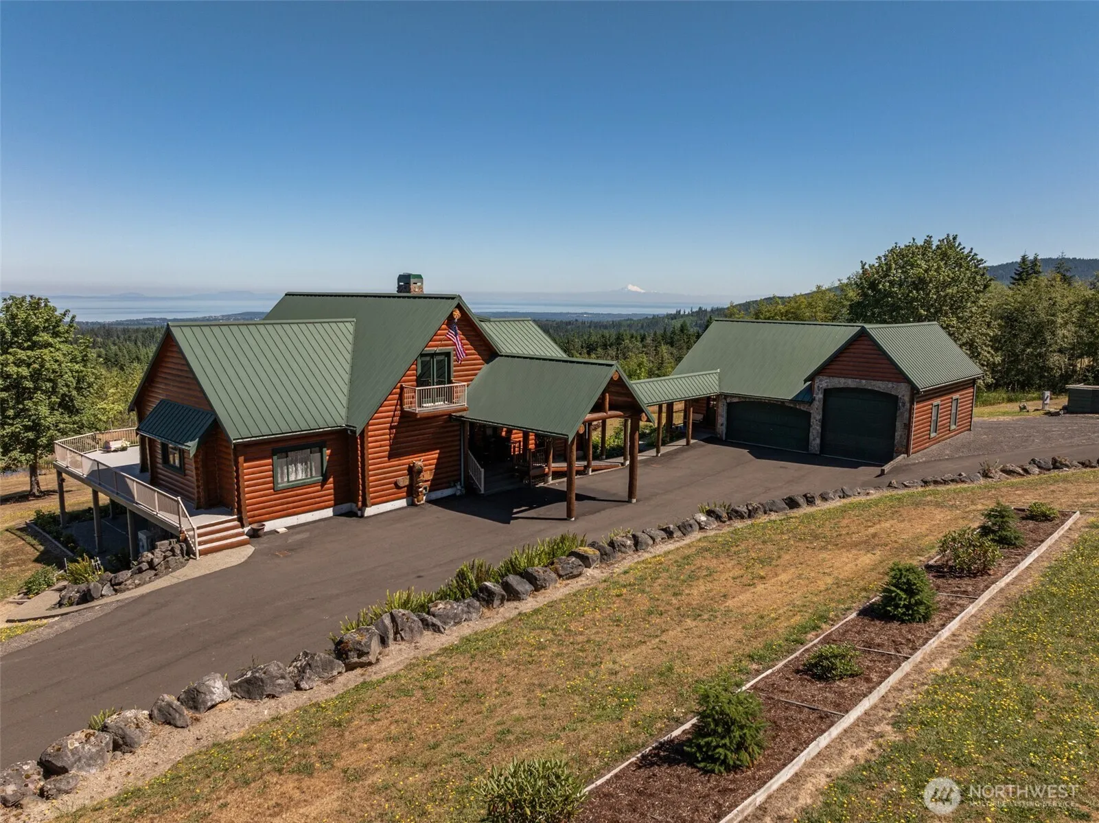 Twenty gated acres, this David Highlander custom log estate offers a level of privacy and craftsmanship that is simply unprecedented. Every inch of this kiln-dried, laminated cedar log home reflects a commitment to quality, from the R60 insulation to the soaring pine ceilings, maple floors, and rich hemlock millwork. The main level is a masterclass in Pacific Northwest design, anchored by an expansive living room featuring a floor-to-ceiling Ledgestone Fireplace, Massive windows frame a cinematic panorama of the Dungeness Valley and the shipping lanes of the Strait of Juan de Fuca. The gourmet chef’s kitchen is outfitted with Cambria quartz counters, a sprawling island, Dacor oven, Sub-Zero refrigeration, and a new Kraus sink. Nearby, the primary suite serves as a private sanctuary with its own deck access, a walk-through custom closet system, and a spa-like bath featuring a jetted tub and quartz finishes. The main floor also includes a media room and a library loft with a south-facing deck. The walk-out lower level is designed for high-end hosting, featuring a secondary family room with a bar, pool table & fireplace. Residents can relax in the private sauna, store a collection in the wine room, or retreat to the massive workshop equipped w/ 220V power. Accessed via a covered breezeway, the guest apt. offers a self-contained retreat with a kitchenette, bath, and a bonus bedroom, situated above a three-car heated garage with a thirteen-foot door to accommodate an RV or boat.