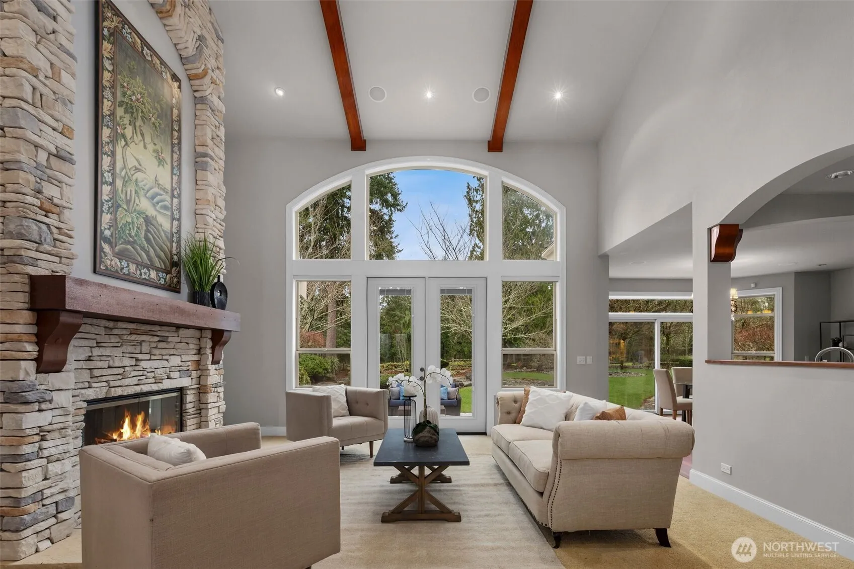 Behind the gates of Washington National, this former Street of Dreams residence offers elevated luxury on a private half-acre overlooking the 17th fairway and reflective ponds. Mornings begin on the patio with coffee as soft mist rises from the water, while evenings are spent fireside beneath soaring 18’ beamed ceilings. Regal street appeal introduces Northwest grandeur, with Brazilian cherry hardwoods, crown molding, and hand-carved railings throughout. The warm cherry kitchen is designed for gathering with a built-in espresso machine, dual sinks, warming drawer, and a nearby wet bar with wine fridge. The main-floor primary suite is a true retreat with fireplace, private patio, and a marble-wrapped bath with soaking tub and rain shower, alongside an adjoining den with fireplace. Upstairs, two flexible bonus rooms provide space for guests, media, and play. A setting as rare as it is refined.