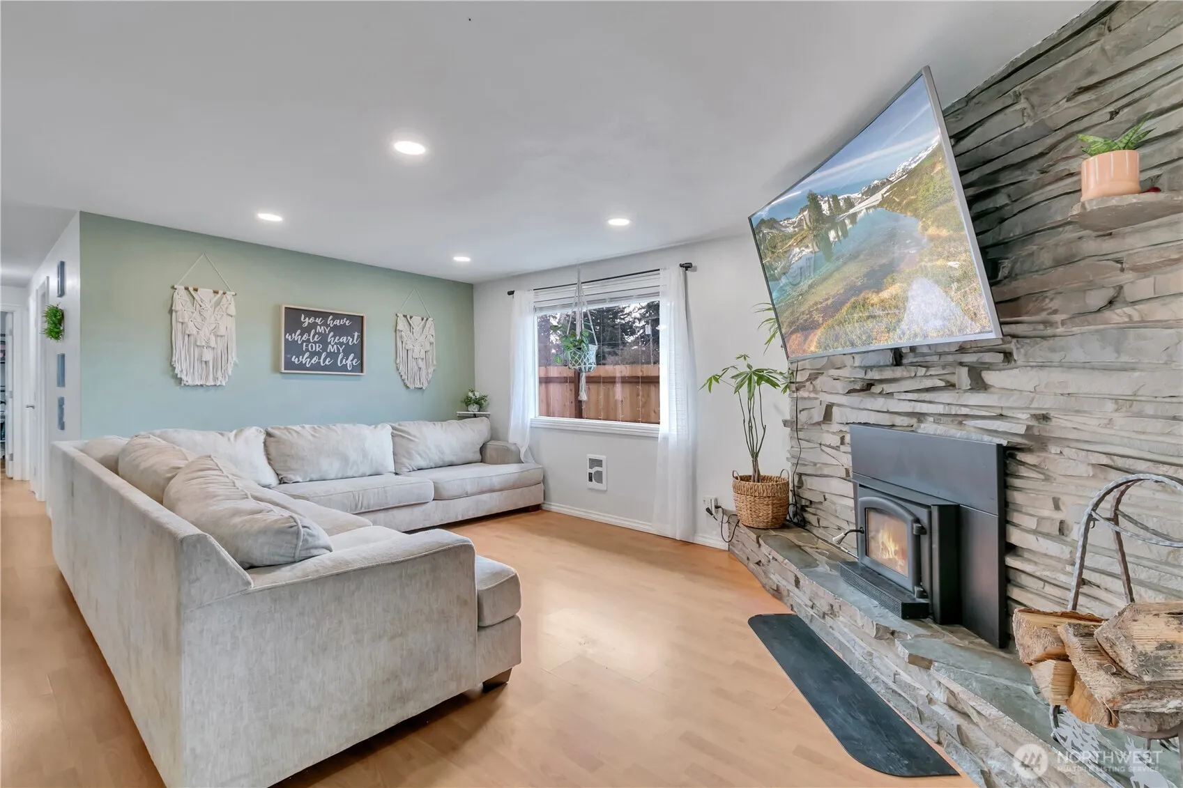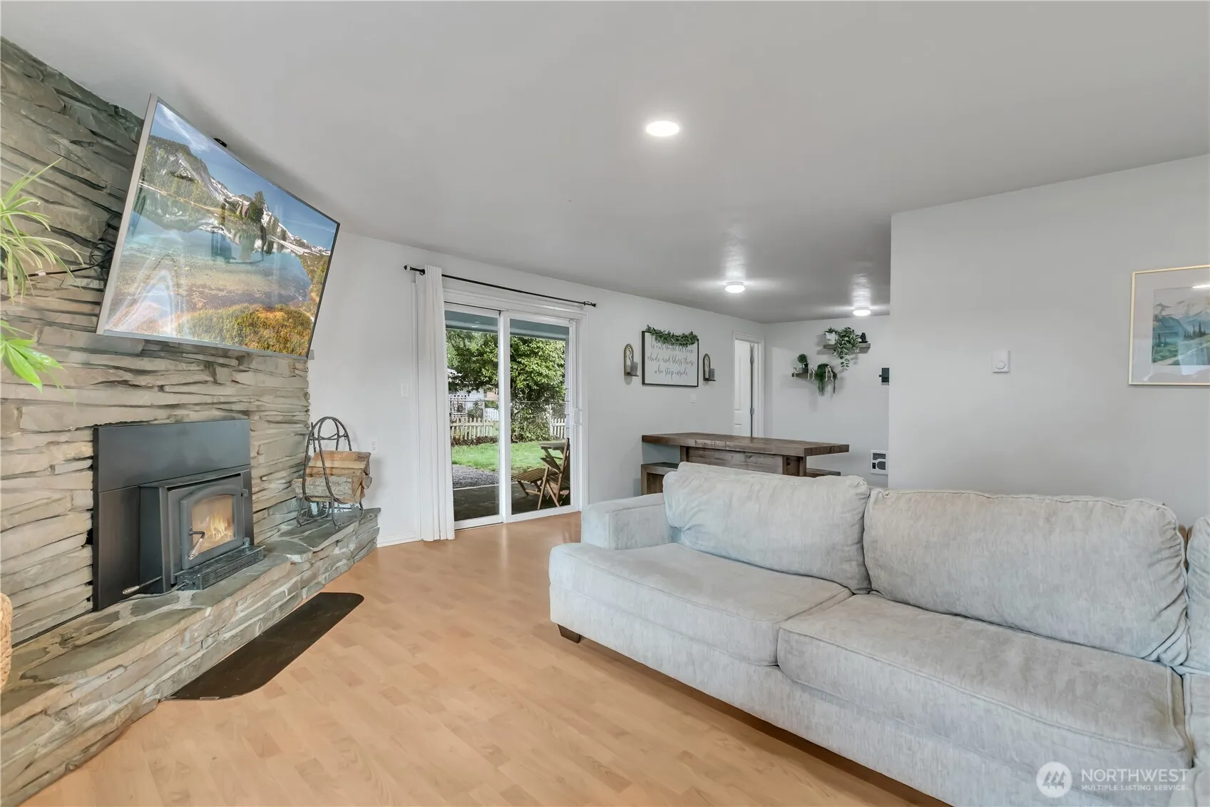 Fully UPDATED rambler on large lot in town! Living room has large fireplace with a wood-stove & laminate floors, with a slider that looks out to the fully fenced backyard. Kitchen offers newer cabinets, all new stainless steel appliances, new counters, a custom-built coffee bar/pantry area, dining space & nearby updated half bath. The 3 bedrooms have original hardwood flooring, & lots of windows for natural light. The full bath is updated with new flooring & an accent wall. This big lot offers lots of parking, including room for an RV or boat, a front deck, covered patio in the back, & 2 great sheds! Washer & dryer can stay. One shed is fully finished with power & water, would be a great home office! No HOA. Permanent lights installed for year round fun. Just shy of a 1/4 acre lot, & conveniently located minutes to town!
