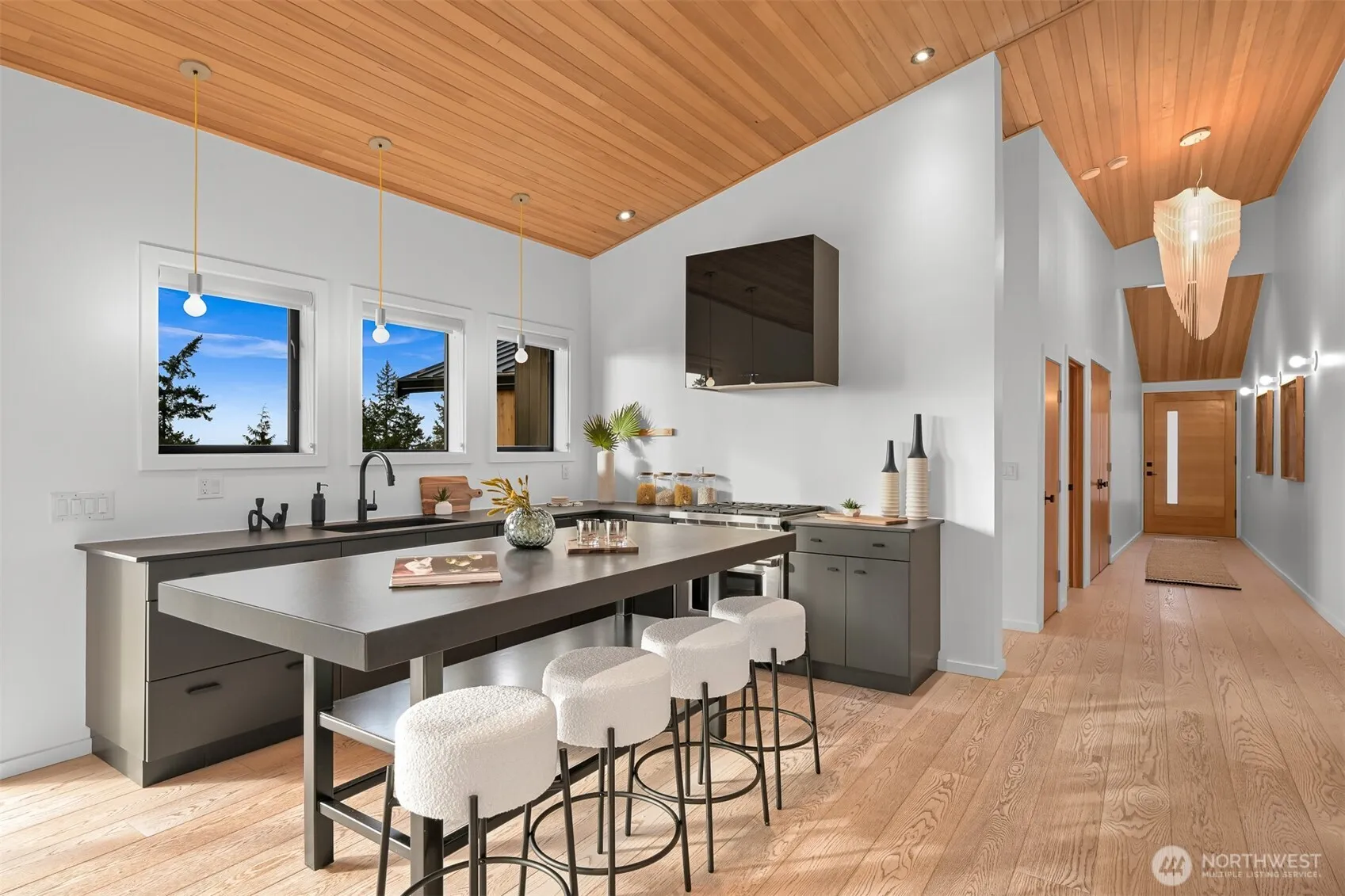 Perched above iconic Chuckanut Drive in one of Bellingham’s most coveted gated community,, this one-of-a-kind modern home captures sweeping water views of the San Juan Islands and an unmistakable sense of calm. Soaring hemlock wood ceilings and refined architectural details create a striking yet welcoming living space filled with natural light and anchored by a dramatic suspended fireplace from France and expansive hardwood decks enclosed with sleek glass railings. Thoughtfully designed for both luxury, comfort & versatility, the home features in-floor radiant heating, built-in patio heaters for year-round enjoyment, and seamless indoor-outdoor flow. Two expansive primary suites offer spa-like en-suite bathrooms and walk-in closets, while a loft overlooks the main living area, enhancing the home’s open, airy feel. The lower level includes a bonus room with a separate entrance, offering both a bedroom and office, ideal for guests or flexible living. A fully fenced, terraced grounds invites entertaining and play, complete with a fire pit and play area & space with plumbing for a future hot tub. Located within a gated community with tennis courts just steps away, the home also includes a garage with electric car charging, laundry rooms on both levels, and the rare advantage of single ownership. An exceptional home blending modern design, premium materials, privacy, and iconic Pacific Northwest beauty just minutes from downtown Bellingham.