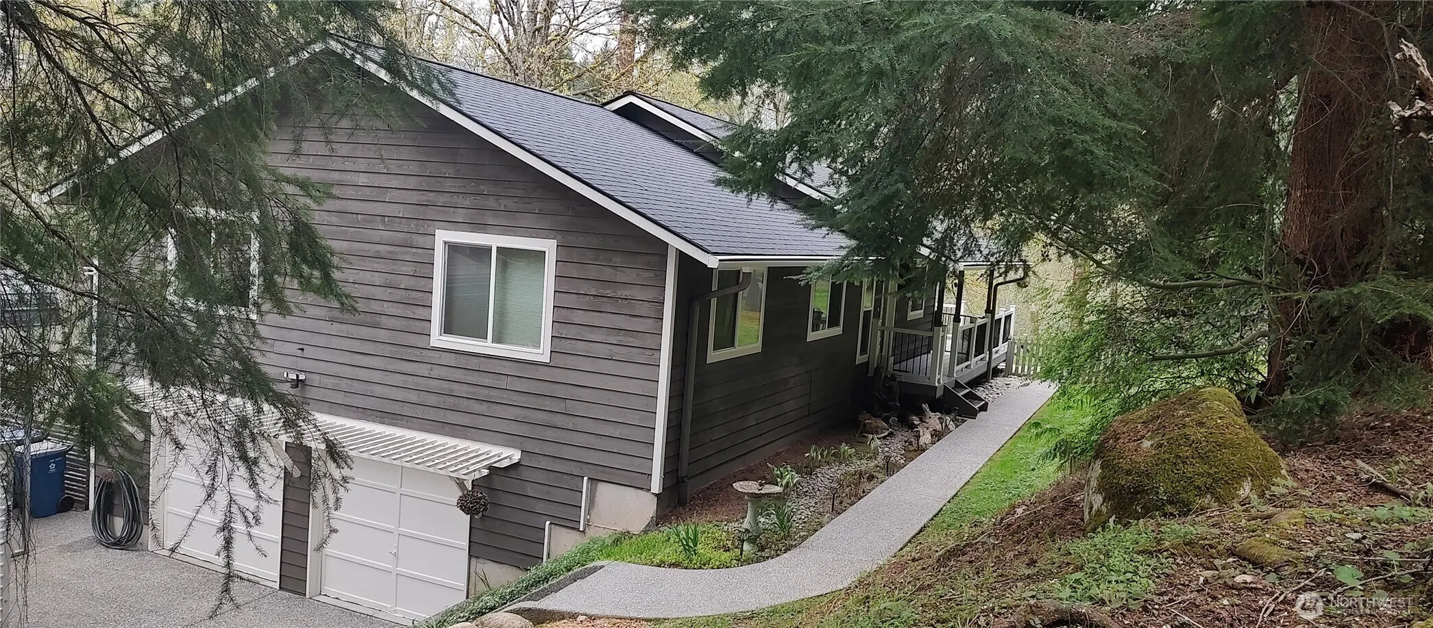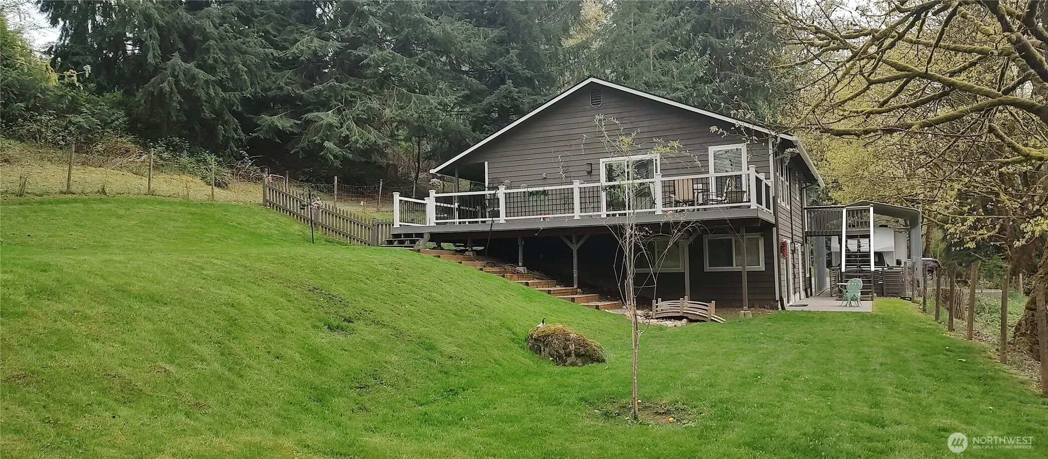 Discover this private, serene nature refuge on 2.35 acres with fully fenced backyard and partially fenced perimeter for kids and/or pets! This daylight rambler style home was recently painted inside and out, with a new roof, new water heater, and new septic pump. Interior is light & bright w/vaulted ceilings, skylight and custom blinds. Vinyl plank flooring, tile, and new Stainmaster carpeting. The kitchen has ample shaker cabinetry, quartz countertops, and SS appliances. Primary bedroom w/.75 bath and deck w/outdoor access to the patio below. The primary bathroom has a custom walk-in shower. Downstairs there is a large rec room w/half bath & utility/laundry room. New Leaf Guard gutters and aggregate concrete driveway and pathways, with covered RV parking and plenty of additional parking. Oversized 2-car garage and entertainment sized Trex deck! Situated above and bordering Woods Creek with beautiful territorial views. Sip your morning coffee while observing wildlife from your covered front porch. Only 7 minutes to town, 522 & SR2, for an easy commute.