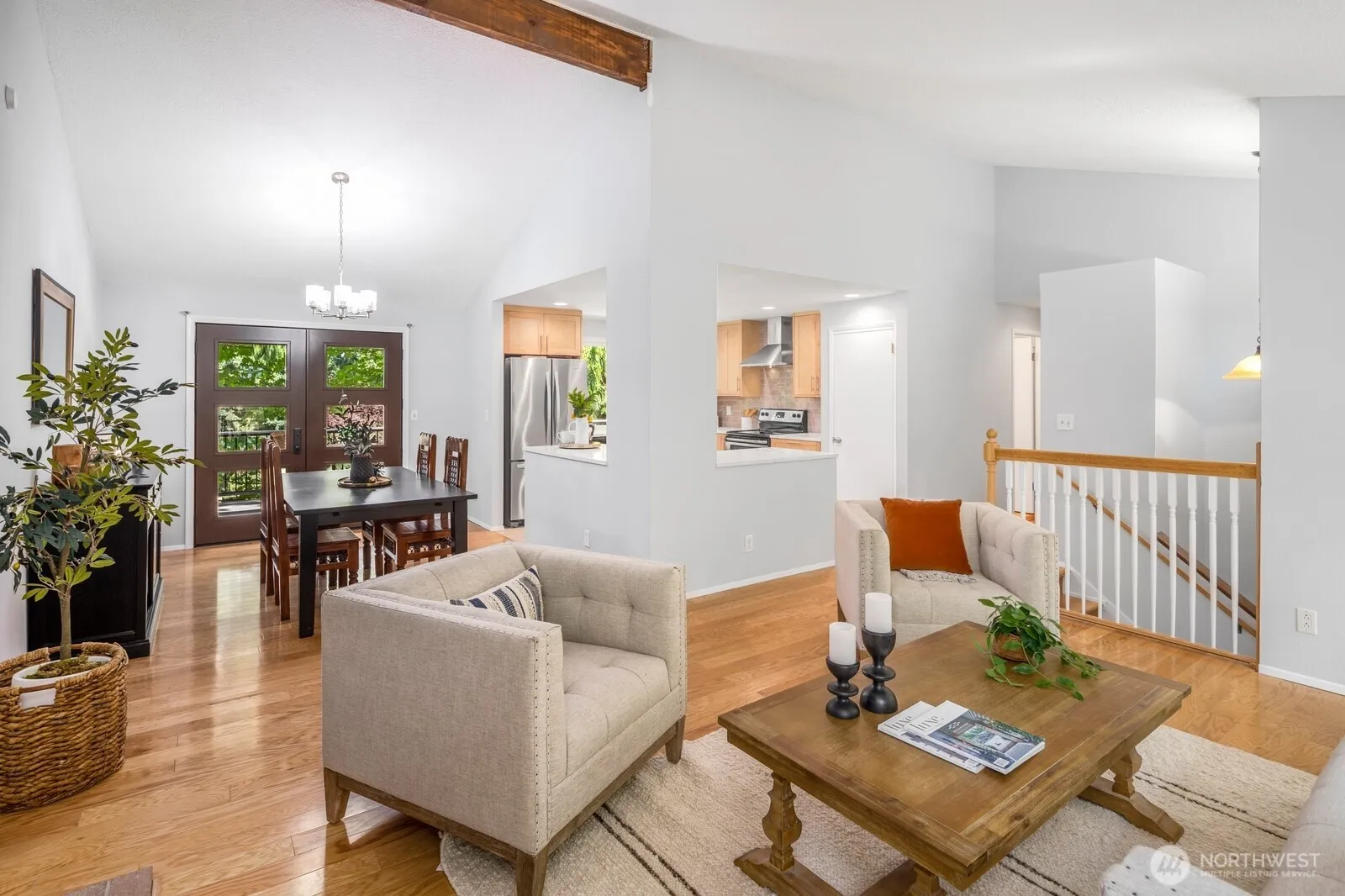 Tucked beneath towering evergreens on an oversized lot, this beautifully updated Kirkland Highlands home delivers the rare combination of privacy, space, and unbeatable city convenience. Vaulted ceilings and an open-concept layout create a light-filled main living area with a cozy wood-burning fireplace, a remodeled kitchen and spacious dining space, perfect for everyday living and entertaining. Three bedrooms are thoughtfully arranged on one level, including a generous primary suite and an additional full bathroom. The lower level expands your living options with a large great room, a ¾ bath, and a flexible space ideal for a fourth bedroom or home office. French doors, from the upper and lower levels, lead to a rebuilt Ipe deck overlooking a serene, park-like yard, your own private escape. Recent upgrades include a heat pump, tankless water heater, triple-pane windows, fresh interior paint and new carpet; this home is truly move-in ready. The oversized 2-car garage has tons of space to store your holiday decorations, recreational gear or even your personal wood shop. All of this, just minutes from Google, parks, trails, downtown Kirkland and top-rated Lake Washington schools, including Peter Kirk Elementary. Come check it out!
