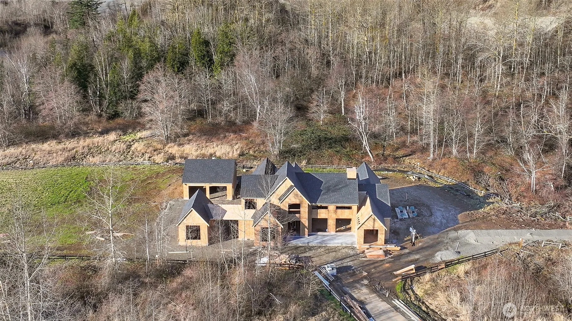 Privately situated on 1.73 acres in desirable Denali Ridge and backing up to over 50+ acres of conservation land, this 3,744 square foot new quality constructed home offers rare seclusion and accessed by a private drive. The great room makes an immediate impression with a soaring 24 foot vaulted ceiling and massive windows that frame the natural setting and create a light filled space that opens naturally into the dining area and kitchen. Designed for function and flexibility, the kitchen is anchored by a 48” range, full-size refrigerator, freezer, and a walk-in pantry with dual access points, providing efficiency and flexibility for everyday use and entertaining. The covered patio extends the living space outdoors with direct access off the kitchen and dining area. The main level includes a dedicated office, game room or flex space, and a well-appointed primary suite featuring a large walk-in closet, sauna, and spa-inspired bath with a large custom shower and soaking tub within a wet room design. Upstairs, two bedrooms each offering a walk-in closet and a shared full bathroom, creating a comfortable and private upper level layout. A two car garage is connected by a portico, and a detached garage provides generous space for hobbies, secondary home office, hangout or toy storage. A rare combination of privacy, acreage, and quality new construction in Denali Ridge.