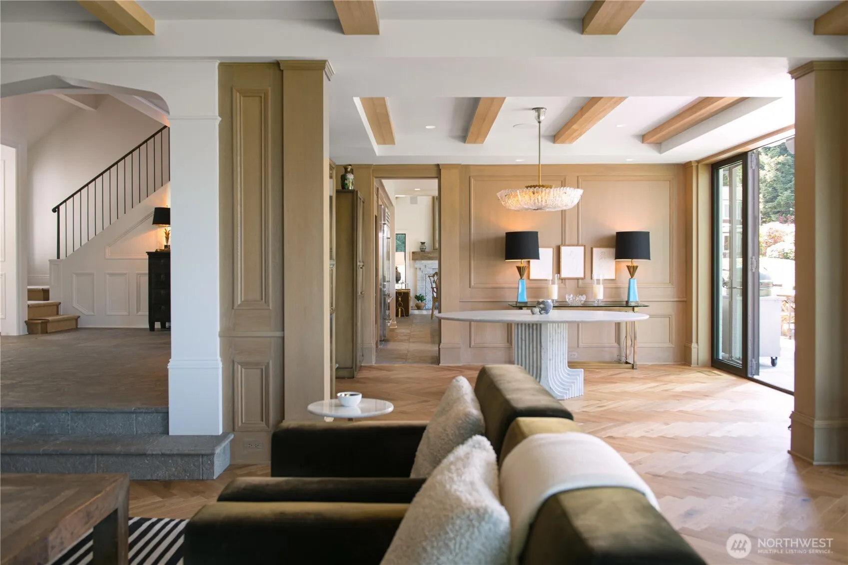 Exquisite English Tudor waterfront property on Hunts Point with sweeping water views on park-like setting with gated drive. Double doors open to two story entry with bespoke iron railings & gorgeous stone floors mined in Ireland. Formal living & dining rooms with oversized French doors open to bluestone patio, huge lawn, fire pits & calming water views. Study with cashmere walls, lacquered trims and bookcases. Kitchen/Great room with fireplace, stunning marble & Ann Sacks terra cotta tile finishes and blue Lacanche range. Primary room w/antique fireplace & Calacatta marble bathroom. Hand-cut herringbone white oak floors. 123 ft of waterfront-new bulkhead/dock/platform lift. 5 Beds, 5.5 Baths. Gym. Full remodel by McKinney Group in 2022.
