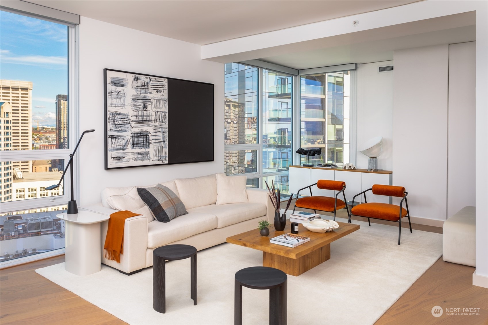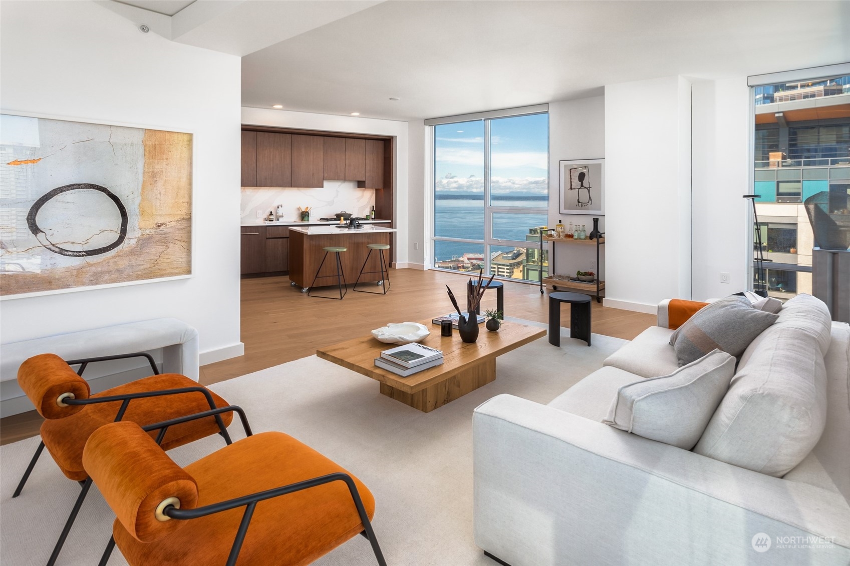 NE corner home with living space meant for entertaining! 180 degree view of the city skyline and Elliot Bay. One parking spot is included. The Emerald is Seattle’s premier address, 1 block from Pike Place Market, 2 blocks from the water’s edge, featuring breathtaking panoramic views. Studios, 1, 2, & 3-bedroom homes are available w/ floorplans ranging 570-1,779 sqft. Residences include custom wood cabinetry, hardwood floors, full-size W/D, Latch keyless entry, & floor-to-ceiling windows. Amenities include fitness center, yoga studio, pet run & spa, guest suite, onsite electric carshare, & full-floor rooftop indoor/outdoor lounge.