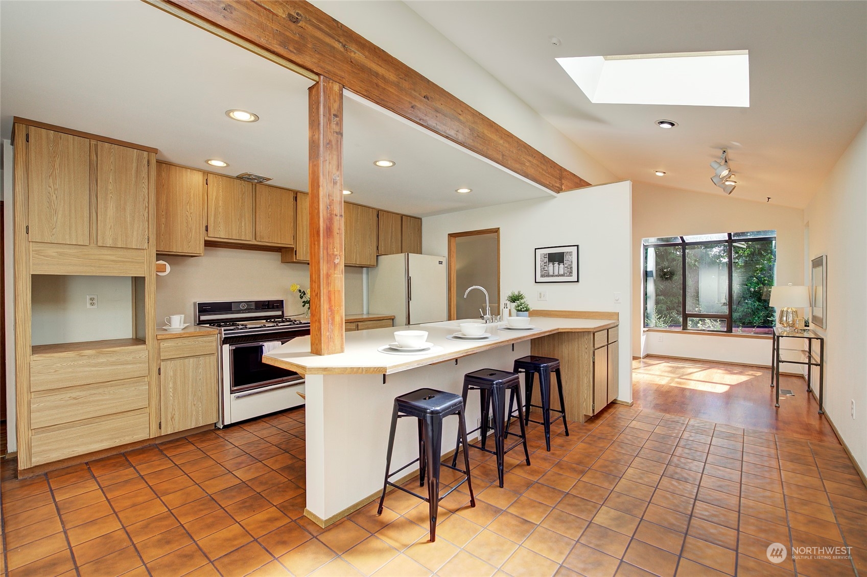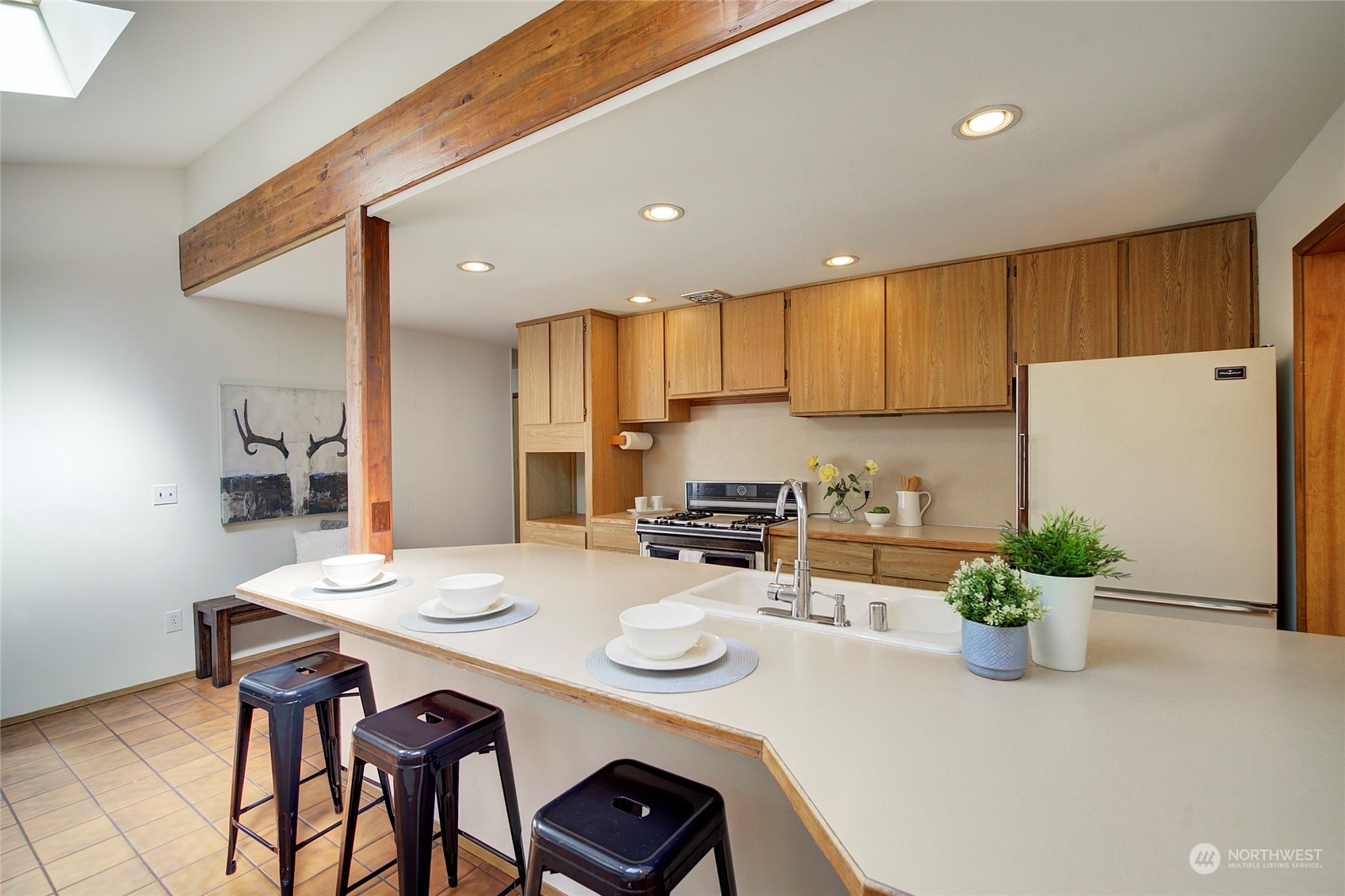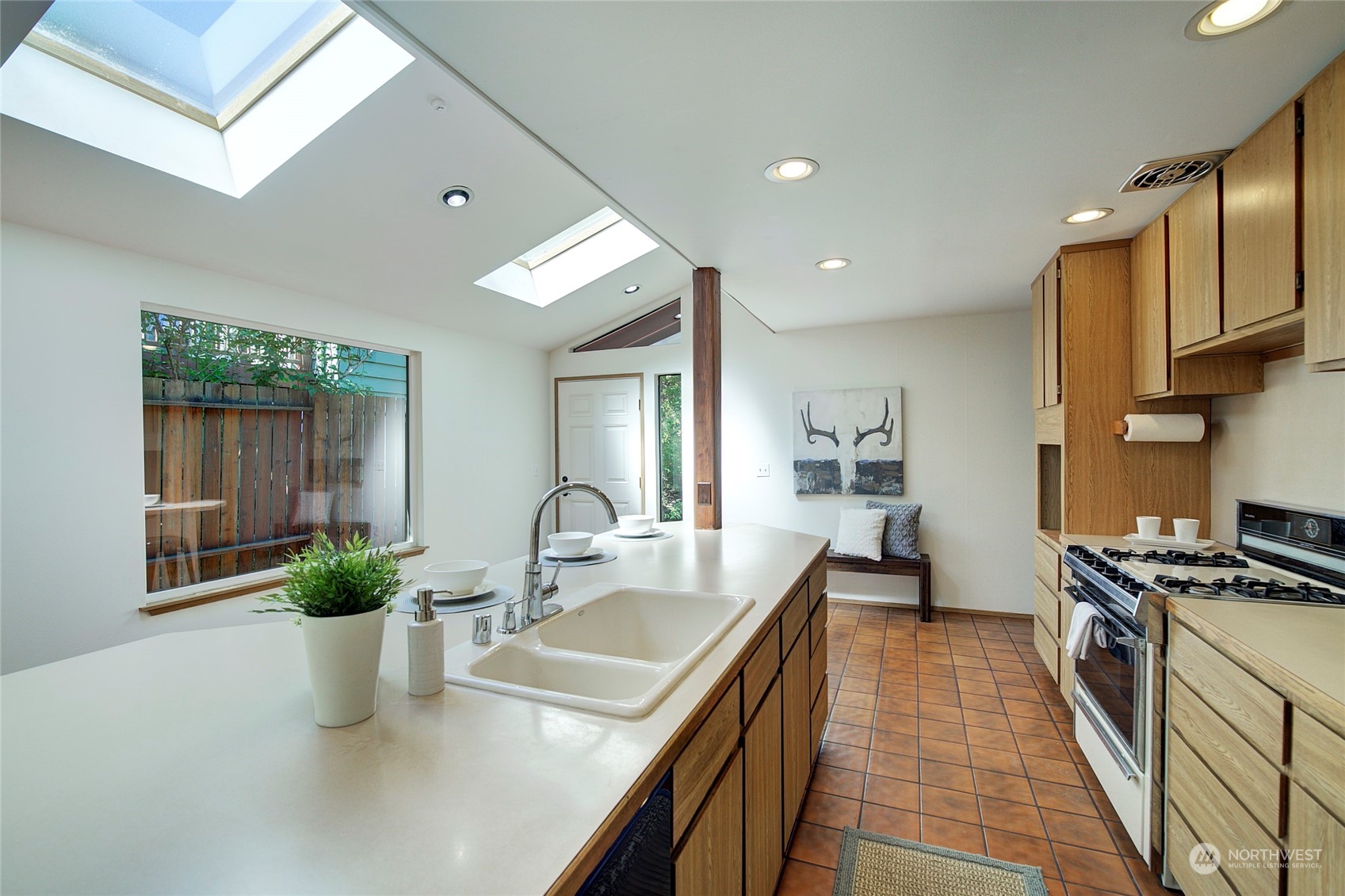 Set down & away from 35th, this private 4 bdrm, 2 bath home is on the cusp of Meadowbrook/Alicia Park neighborhoods. Bright open kitchen with skylights, wood beamed elevated ceiling, oak floors, fresh paint & wood fireplace harken back to mid-century beginnings. Dine at the bar in spacious kitchen or adjacent sunny dining rm. Relax in Living Rm w/ deck overlooking greenbelt. Lower level has 4th bdrm &.75 bath. Cool Rec room has gas fireplace, orig, wood paneling: potential kitchenette or MIL space with a separate entrance & patio access. Large closets with plenty of storage throughout. Oversized garage has shop/storage space. Terraced mature garden with 2 patios & shed awaits your green thumb. Public Pool, Comm. Center & Park 2 blocks away.