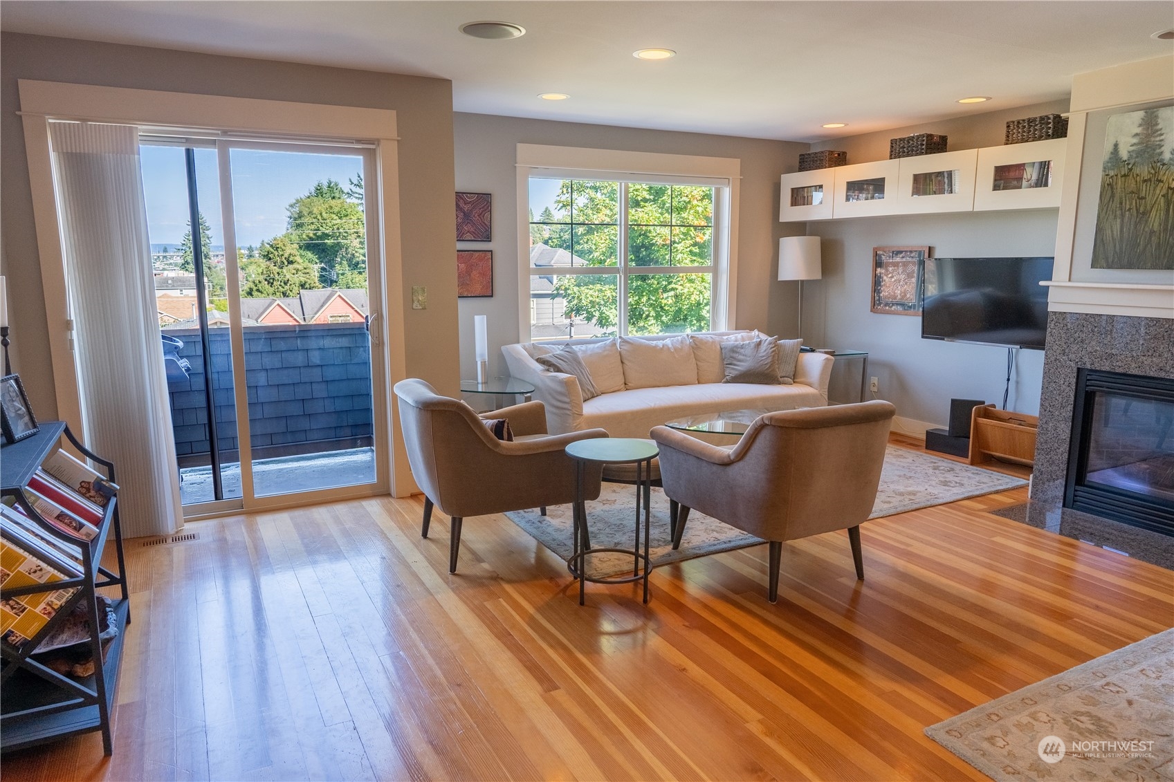Huge open Craftsman style townhome with amazing views! 3 bdrms & 3.5 bth, blocks from Seattle Pacific University. Penthouse primary suite w/vaulted ceilings, jetted tub, walk-in shower & closet, 2nd laundry & large view deck! Fir Floors, gourmet kitchen with granite, stainless steel & breakfast bar. A/C, gas frpl, a half bath & balcony on main. Tile entry & 2nd primary suite on the entry level. Lower level: bedroom, full bath, secluded patio, 2 closets & 2nd laundry room. Garage + off street parking spot!