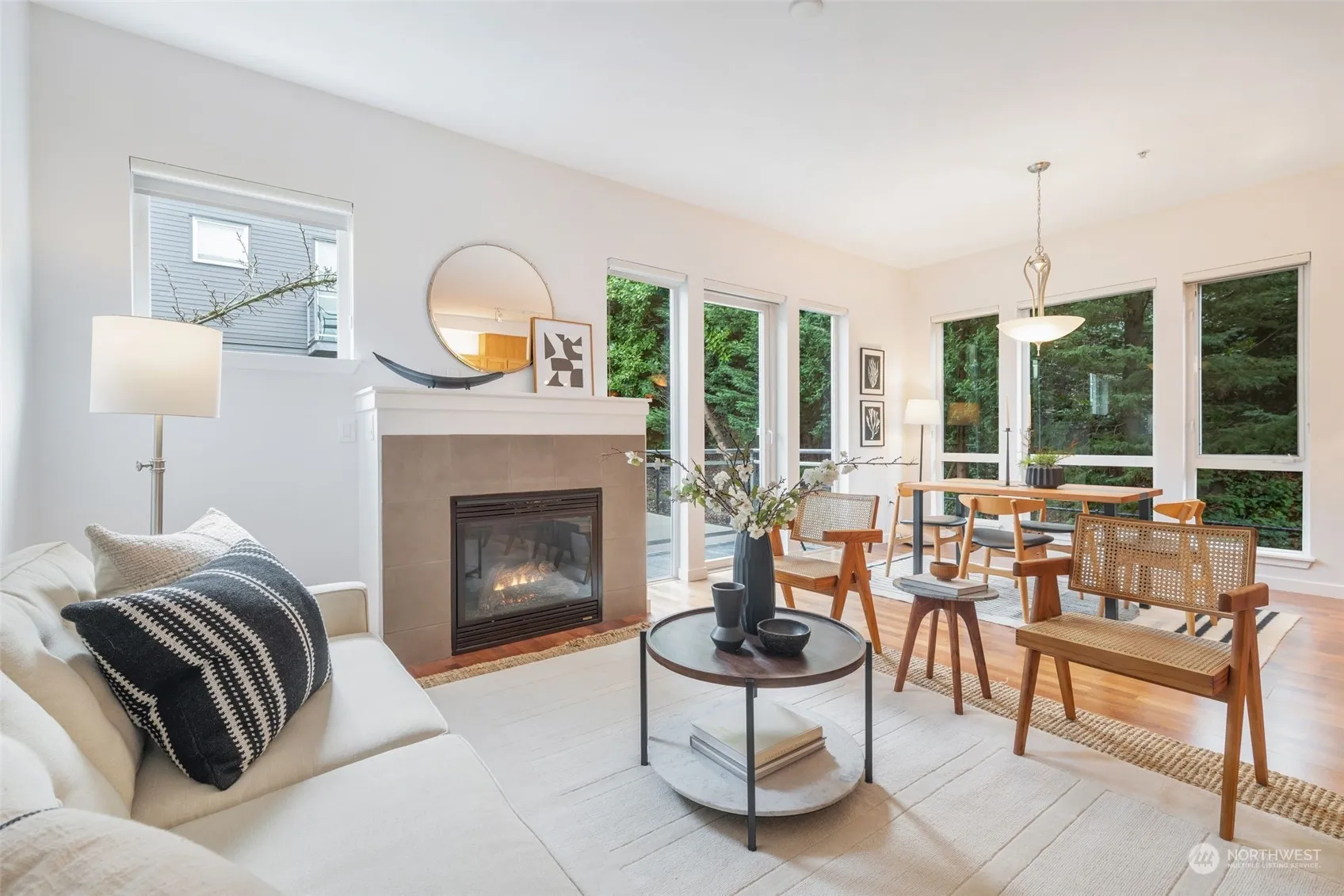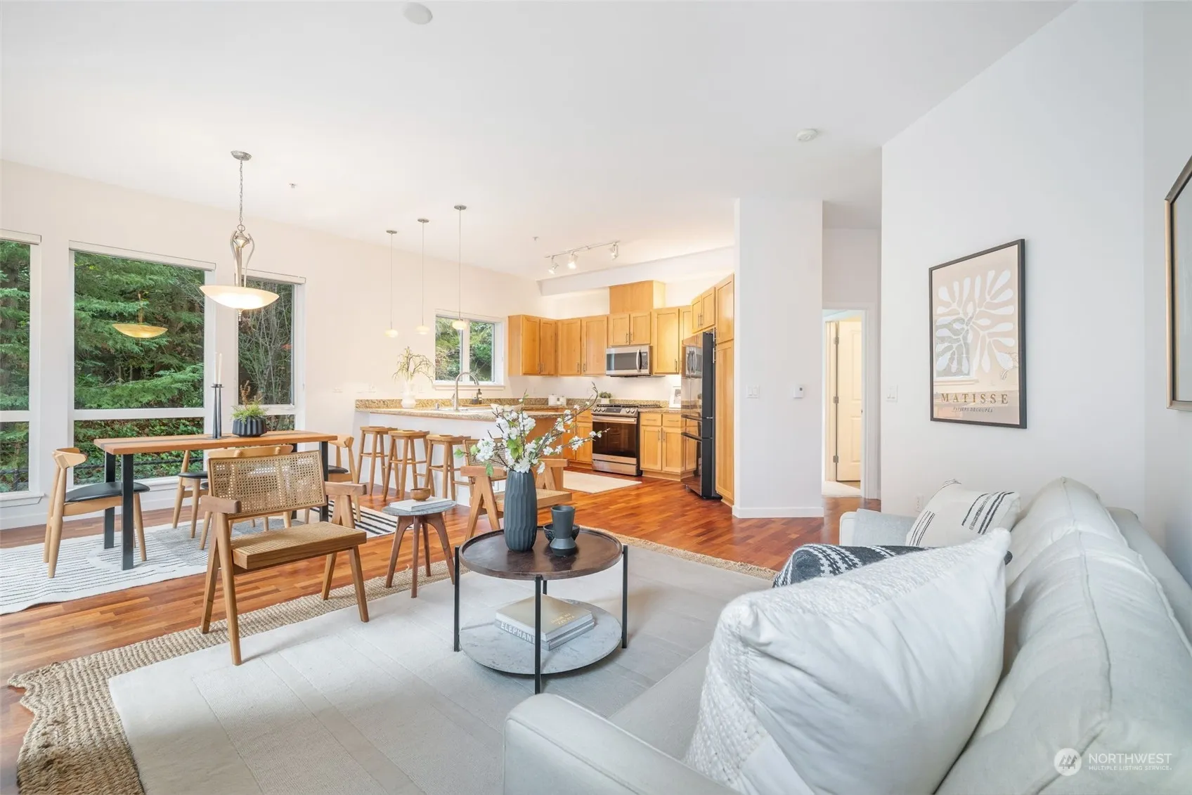 Spacious, sought-after, corner home perched against an evergreen backdrop offers serenity and walkability in the heart of Downtown Kirkland. An elegant entry welcomes you into this coveted floorplan with dramatic 9’ ceilings and flexible office nook. Windows wrap the open kitchen and generous living room with light and nature. Enjoy morning coffee from the charming balcony and unwind in your private, primary bedroom with walk-in closet and ensuite bath. A second bedroom and bath add space and flexibility. Well-managed, pet friendly building just steps from PCC Market, Kirkland Urban and the 12.5 acre Peter Kirk Park.