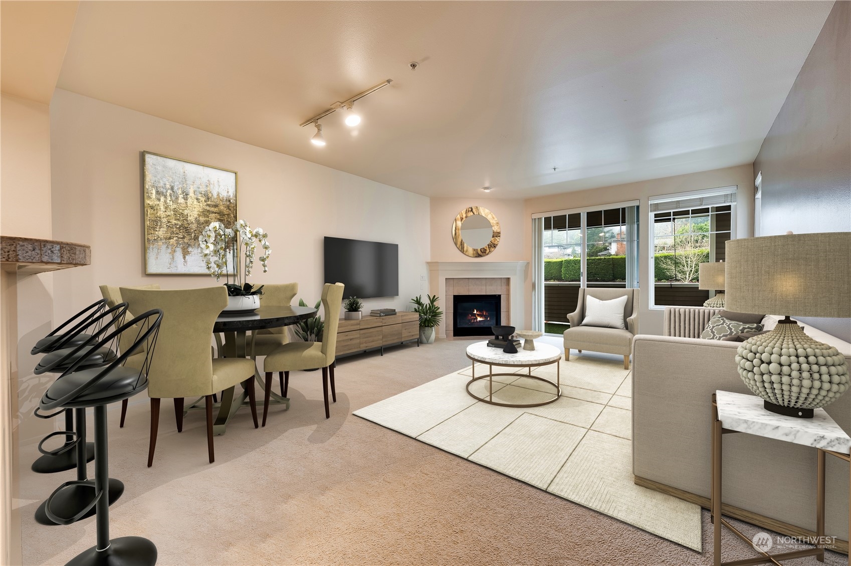 Private & quiet condo in a park-like setting backing up to a greenbelt. Large kitchen w/eating bar, granite countertops, SS appliances, and gas fireplace. Large primary suite, with 2 closet space, and ensuite spacious bath. This condo features over 900 square feet of living space, covered spacious balcony, tall 9 ft ceilings, in unit w/d, 2 secure garage parking spaces, and extra storage. Le Chateau has a beautiful common area for hosting (w/kitchen facilities), gym for residents, gathering area & pool, perfect place to relax year round. Wonderful location w/easy access to I-90 & 405, close to Factoria, Bellevue College, delicious restaurants, groceries, shops, services, transportation & more. Come take a look before this one is gone!