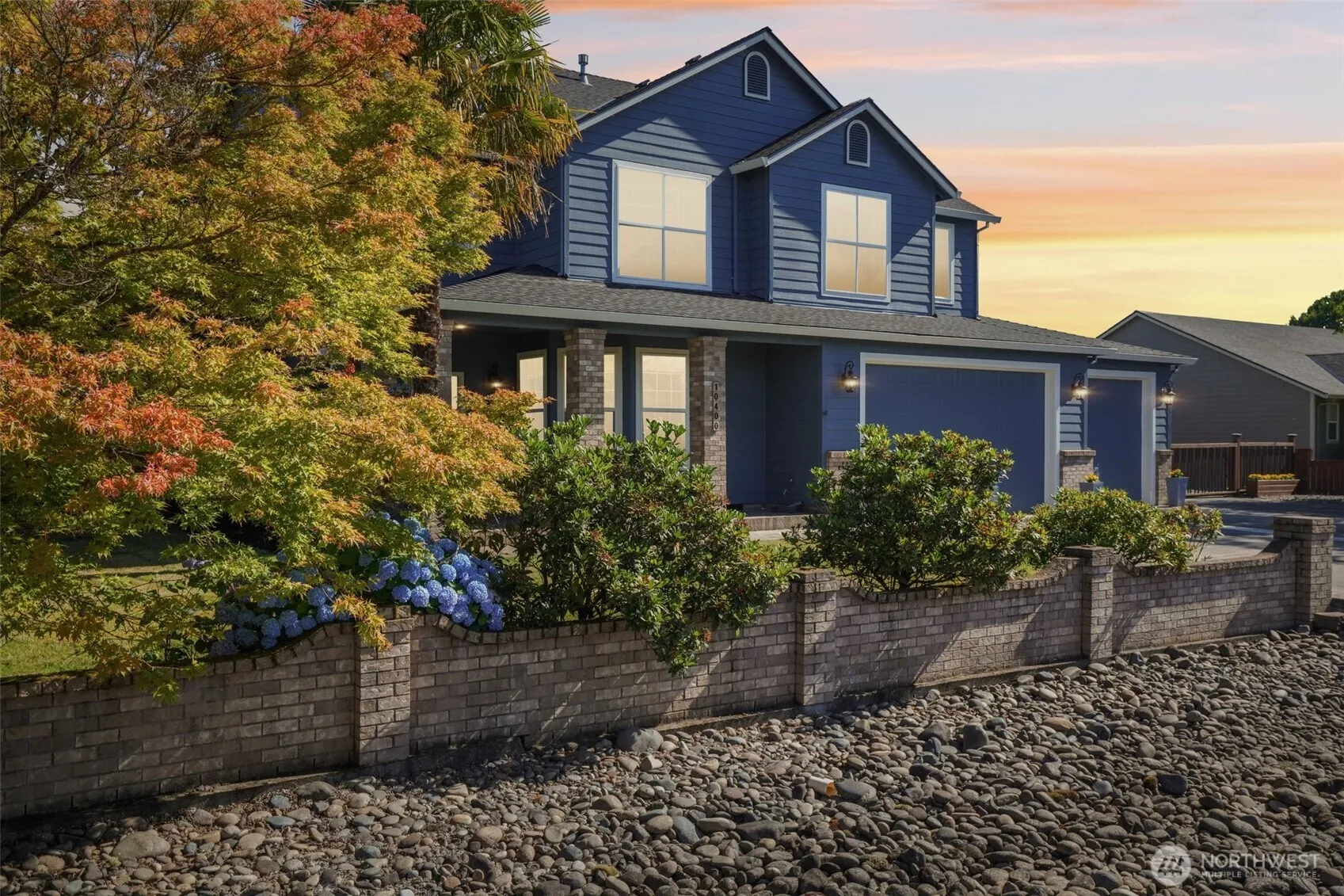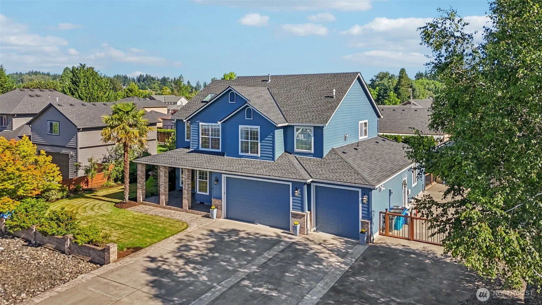 Welcoming front porch, oval leaded glass entry door. Entry w/soaring ceiling, clerestory windows, skylight. Arched entry to LR. GR FR w/gas FP, wall niches. Island/eat bar SS kitchen, granite, ample cabinetry some w/glass panes, WI pantry. Dining w/bay window wall, slider to patio. Primary suite, gas FP, WI closet, ceiling fan, vltd ceiling, bath w/dual sink&makeup tiled vanities, jet tub, shwr, skylight. 3 addtl bdrms. Bath w/dual sink tiled vanity, shwr. Den/ofc w/half bath. Pwdr rm w/pedestal sink. Laundry w/W&D, sink, BIs. Vltd, hi ceilings&baseboards, surround sound, central vac. Patio. 3-car X-deep garage w/BIs. 324sf heated workshop,workbench&BIs. 7×12 ft shed. RV pkg. Mortgage savings may be available for buyers of this listing.