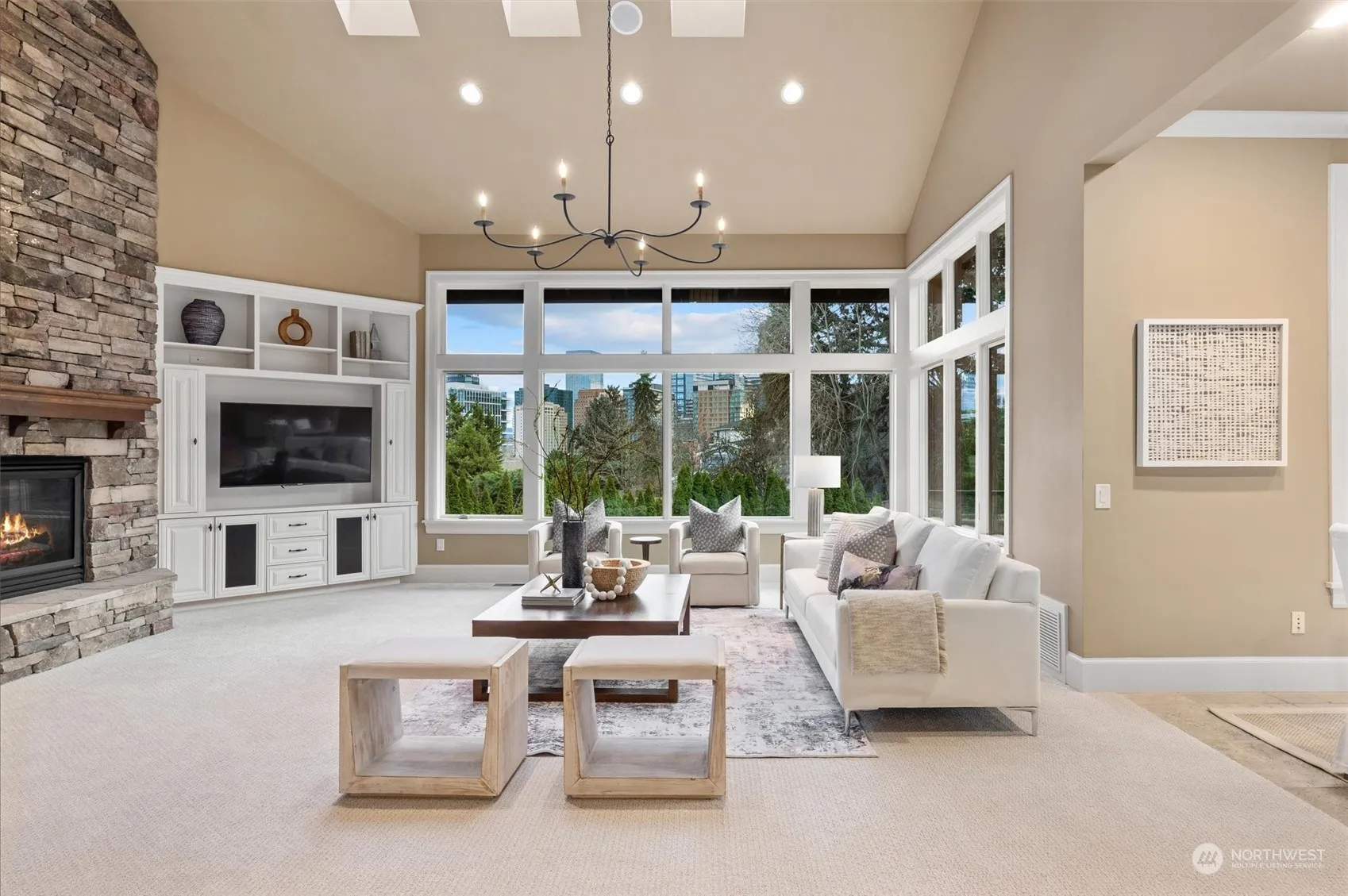 Sparkling city views are the backdrop for this luxurious home situated for privacy in West Bellevue. An entertainer’s palace where oversized rooms & high ceilings set the stage w/grace. Main floor entry w/office tucked away along w/formal dining. Around the corner is a great room concept where you have sweeping views of the city skyline. Dine alfresco as the city lights twinkle & prepare meals comfortably on the covered deck overlooking the sprawling lawn. 3 car finished garage & walk-in pantry offer convenient amenities. Ideal layout w/four bedrooms up incl an opulent primary suite w/ laundry in closet fit for a queen. Lower level completes the home w/guest suite, media & rec rooms, +studio. Top Bellevue schools! 5 Blocks to Dwtn Bellevue