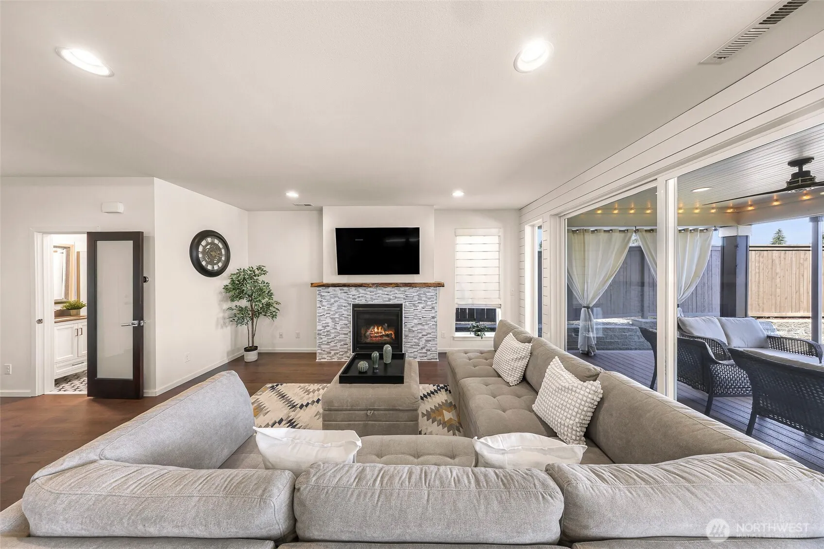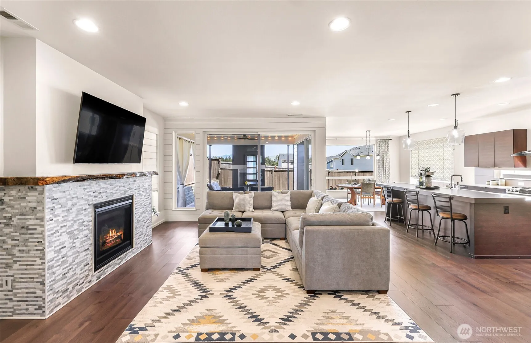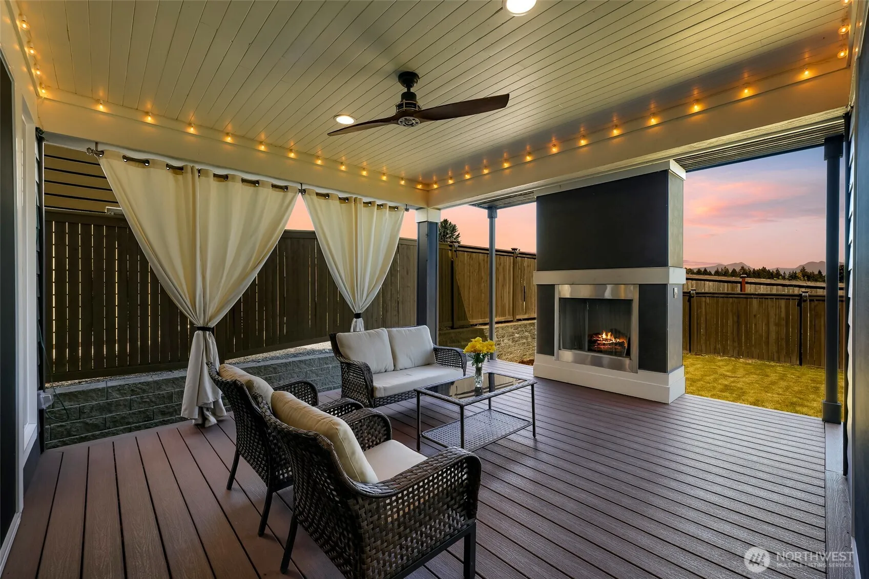 Wonderful MainVue home w/one of the largest back yards in Eaglemont + $20k in upgrades! West facing layout, valley & mountain views, hardwoods, huge island, quartz countertops, walk-in pantry, gorgeous covered composite deck w/fireplace & huge sliders + family room w/gas fireplace & live-edge mantle. Main level den w/built-in Murphy bed & ¾ bath- perfect for guests! Primary bedroom w/fabulous en-suite boasts marble tile, dual vanity & walk-in closet w/built in cabinetry that conveys elegance! 3 more bedrooms up, 2 w/walk-ins & inserts plus bonus room! Central AC, forced air heat, tankless hot water heater, 3 car garage w/ overhead storage, EV charger & all appliances included! Mortgage savings may be available for buyers of this listing