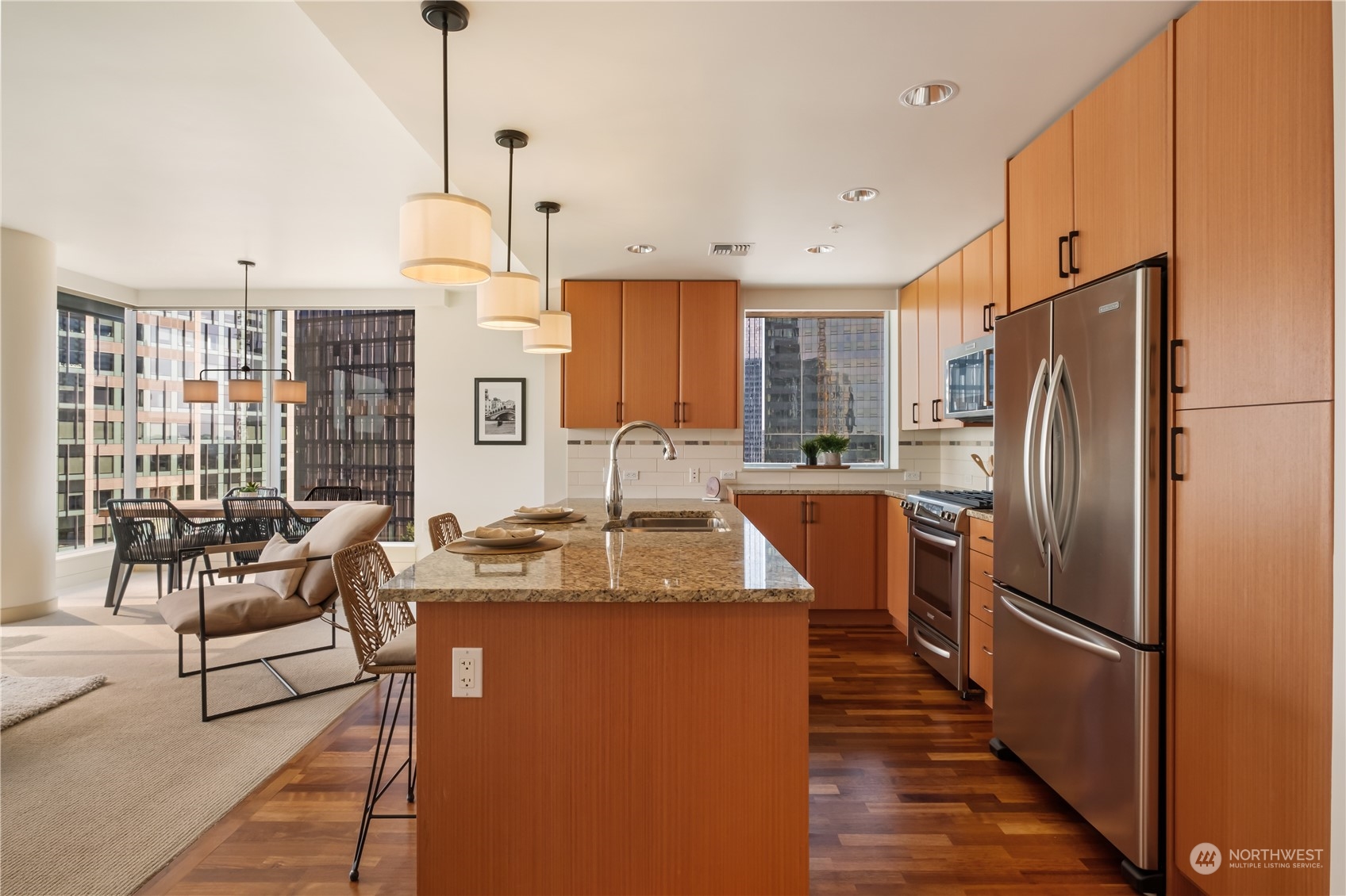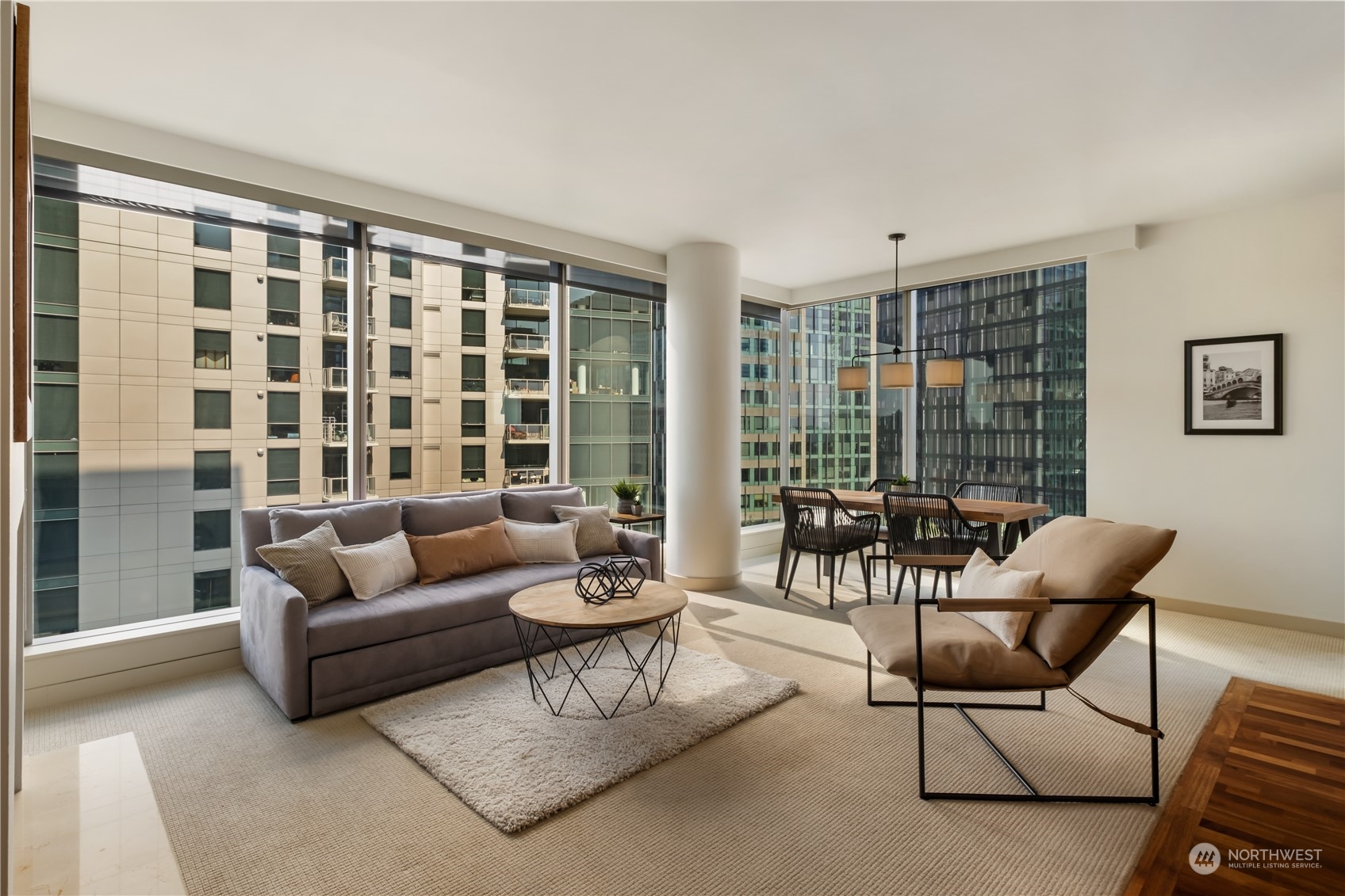 Welcome to urban luxury at its finest! This coveted corner unit on the 15th floor of Washington Square, located in the heart of downtown Bellevue, offers expansive city views. With 2 bedrooms and 2 baths, including a primary suite with private deck access, this home provides an open and bright layout with 9.5′ ceilings and full height windows. The kitchen boasts granite slab counters, gas cooking, and an island counter for seating. Enjoy the convenience of 2 secure side by side parking spaces and a storage unit. Washington Square lavish amenities include 24-hour concierge service, a fitness room, an owners lounge, and a spa. Future rail station, mall, restaurants, and more are just minutes away. Don’t miss out on this phenomenal location!