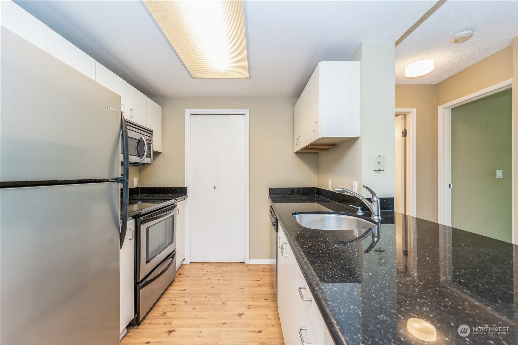 Spectacular 15th floor 1 bedroom condo w/city and Elliott Bay views! Facing directly North, this home offers unbelievable views from every room. The spectacular floorplan is designed with an open kitchen with walk-in pantry and breakfast bar that overlooks the living room; full bathroom; and a graciously sized bedroom, perfect to accommodate full sized furniture. Additional highlights include plenty of onsite storage, ample closet space, hardwood floors throughout kitchen & entry, carpet in living & bedroom, covered private VIEW balcony, and portable a/c capability! Amenities include 24 hour concierge services, swimming pool, sauna, clubroom, fitness center, and two rooftop view decks. Water, sewer, garbage, storage, and parking.