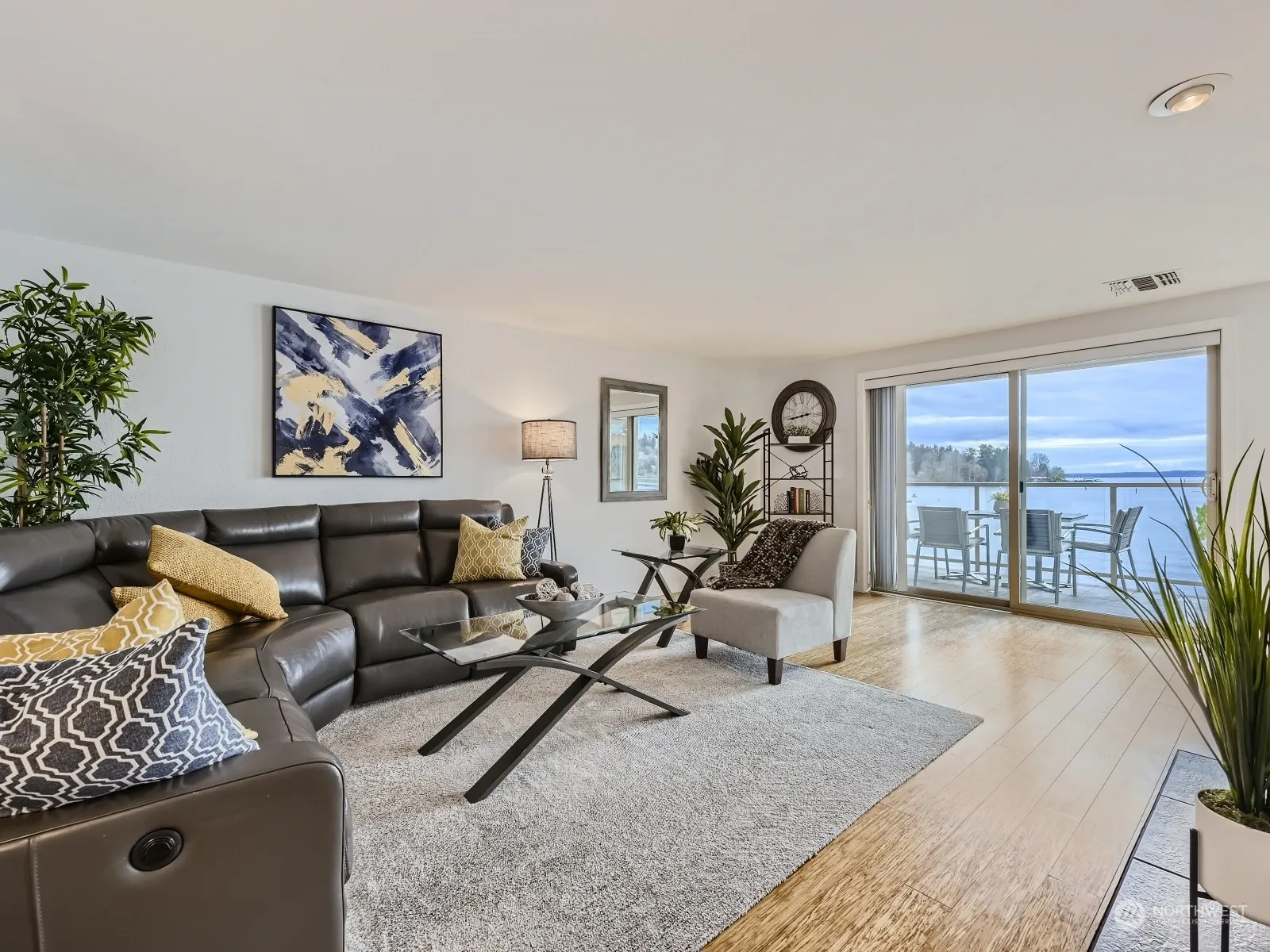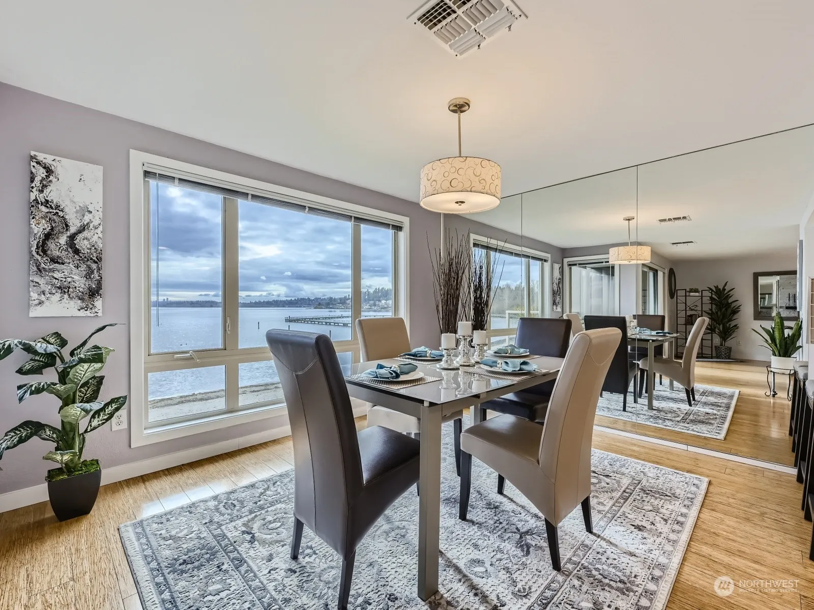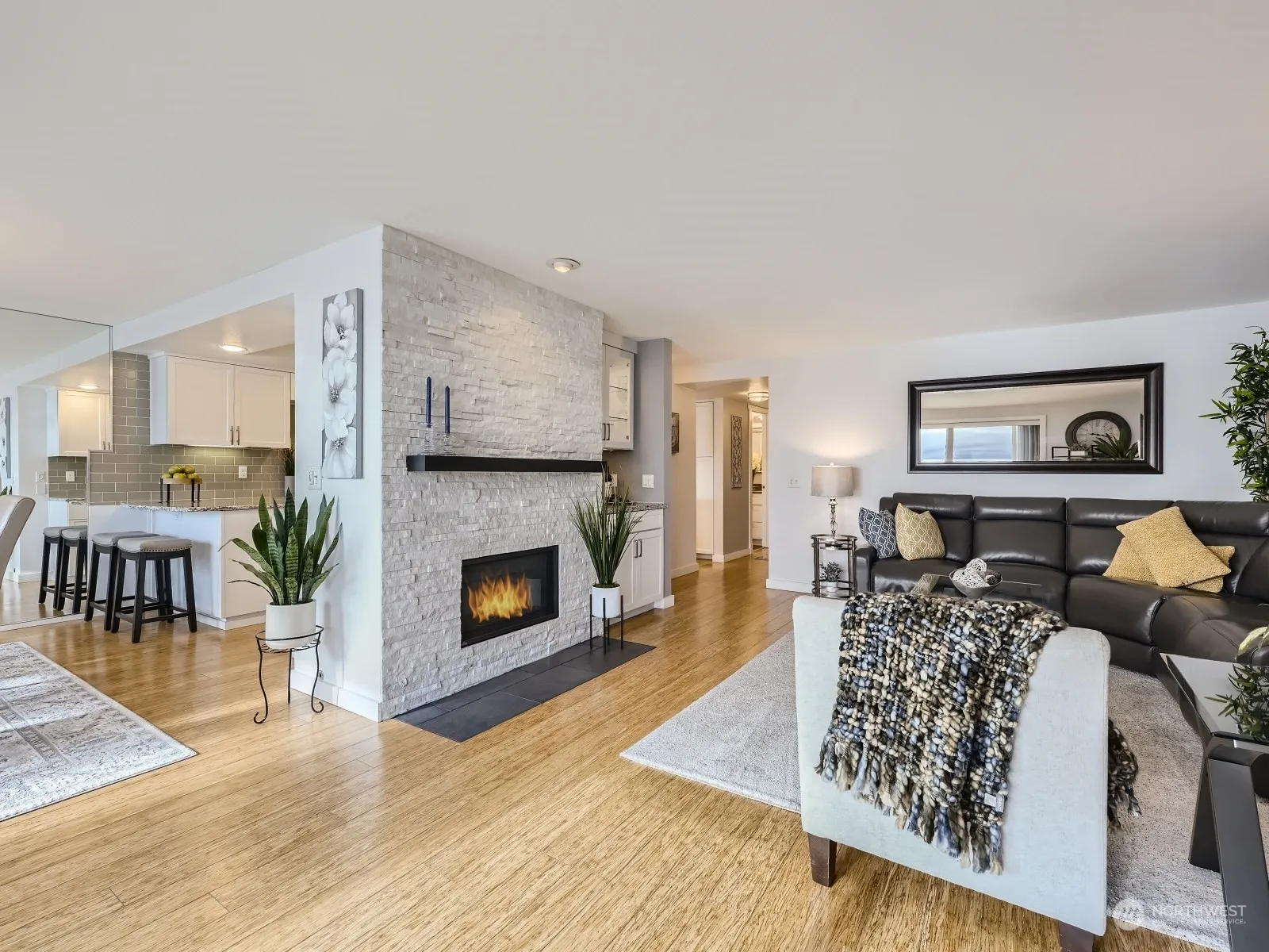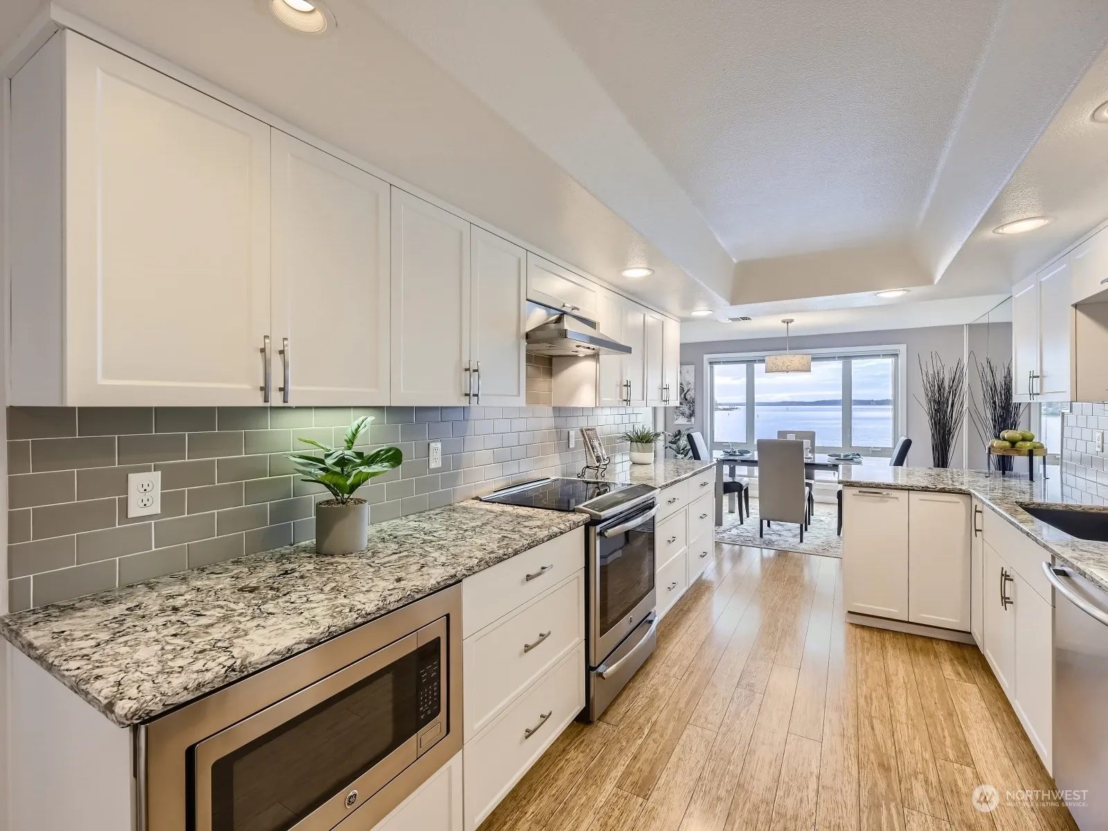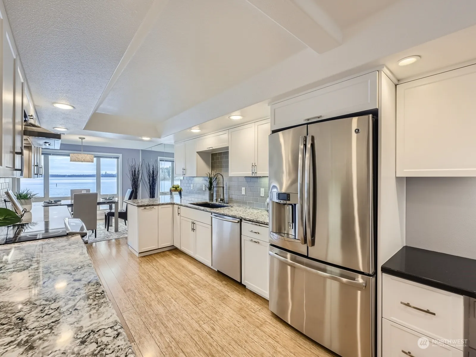 Beautifully updated 3rd floor unit at highly sought-after Juanita Shores with unobstructed Lake Wash, City & Mountain views! Total kitchen remodel features abundant white shaker cabinets, slab counters, induction stove/range, breakfast bar & built-in desk! New modern gas fireplace/surround, huge primary suite w/absolutely luxurious SPA-inspired bathroom featuring stunning double-head shower, high-end fixtures, gorgeous vanity w/lighted mirror, walk-in closet. Newer doors/millwork & bamboo hardwood floors! HOA dues incl internet/cable TV & gas. Community features private beach/lawn, buoy moorage & SUP/kayak racks, gated access, garage, elevator, & pool! No rental cap, 2 pets max, quick walk to parks, restaurants, bus stop, & Juanita Village!