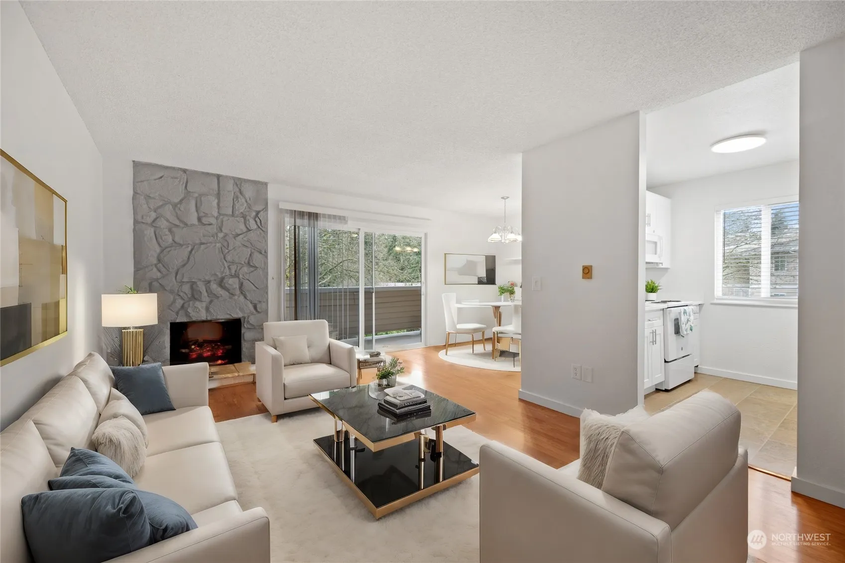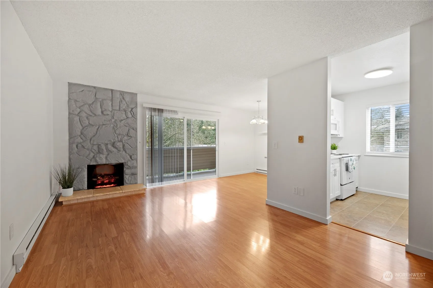 Welcome to your stunning, newly remodeled 1 Bed, 1 Bath Condo in the heart of Totem Lake! This bright unit has been thoughtfully redesigned with high-end finishes & modern conveniences. Located on the Top Floor. White kitchen boasts beautiful Quartz Countertops, New cabinets & Soft Close Drawers. New Refrigerator and Dishwasher; Microwave & Electric Stove included as well. Very nice engineered wood like floors. Spacious Living Room w/new Electric Fireplace. Roomy Dining Room & Large Storage Closet or Pantry off hallway. Remodeled Bathroom w/Tile floors, New White Cabinets, Quartz Countertops and New Combo Washer/Dryer. Large Bedroom has a walk in closet. Private Balcony and 1 Designated Parking Spot. No rental cap. Welcome home.