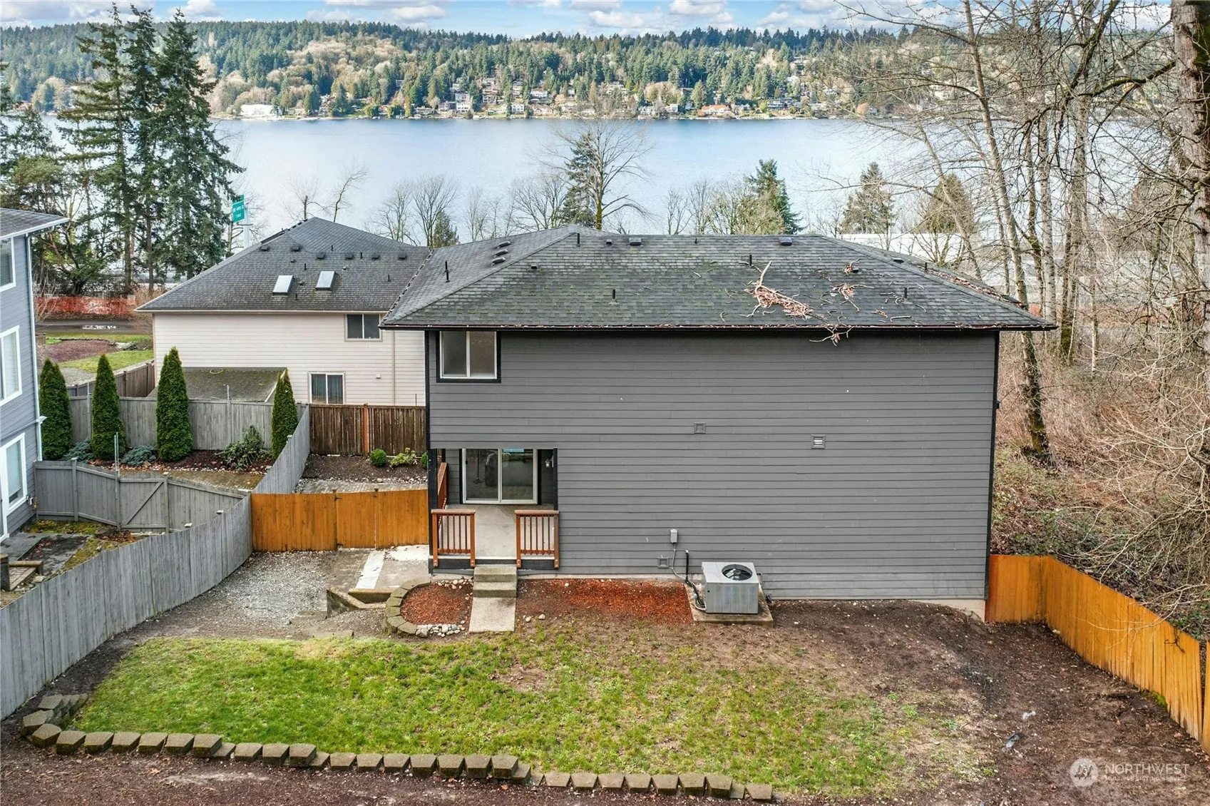SPECTACULAR VIEW!! Panoramic View of Lake WA from all areas of house. Experience the serene beauty of Lake Washington at an unbeatable price! Designed with entertaining in mind, the main level features an open-plan layout with large windows throughout the kitchen and living area, leading to an inviting covered patio and a private, fully fenced backyard. Top-floor boasts an expansive primary suite complete with a sumptuous 5-piece bath, featuring a relaxing soaking tub and a generous walk-in closet. Another expansive bedroom on the same level, ensuring ample privacy and comfort. The versatility continues on the lower level, offering a guest suite or home office, alongside a cozy family room that opens to a covered patio.