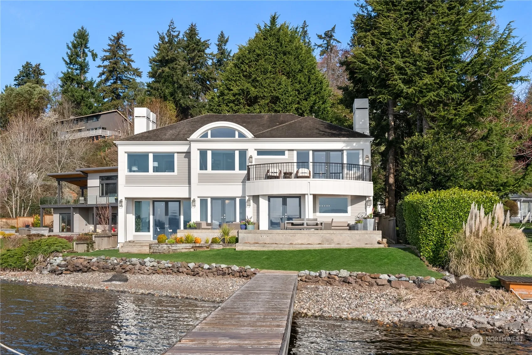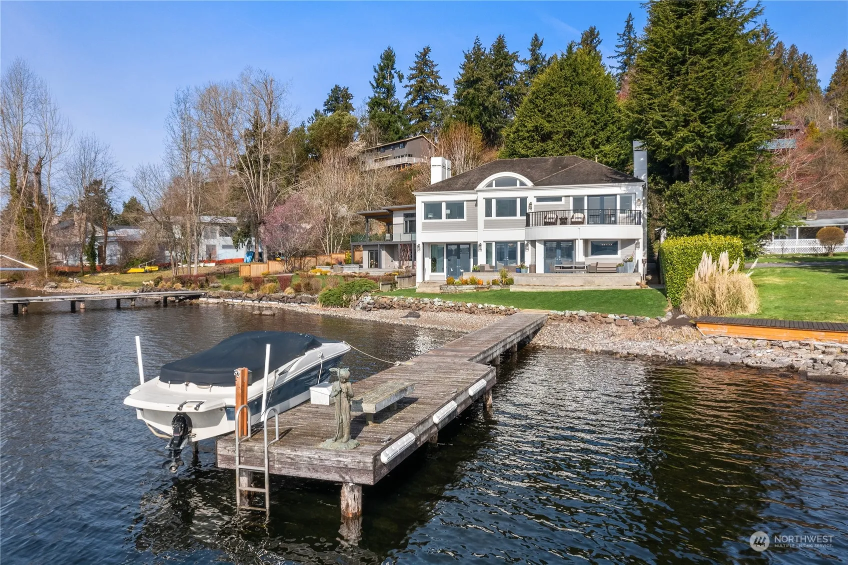 Sensational Lk WA waterfront home near the end of Juanita Pt. Placed to take advantage of the vistas while maintaining rare wtft privacy, this 4BR 4.5BA contemporary was custom built in 1992. Light-filled w/some of the best views on the Lake from nearly every room, renovations in last 4 years incl siding, windows & doors, hardwoods, baths w/designer marble & tile & chef’s island kitchen w/Wolf stove. New 50YR roof installed April ’24. French doors to patios, level yard w/75’ of no-bank wtft & 84’ dock & boat lift. Driveway redone & widened. Just mins to Juanita Village & Park & less than 10 mins to downtown Kirkland. Mesmerizing southerly views of Mt Rainier, Bellevue, Seattle, sunrises & sunsets down the wide part of Lake Washington – WOW!