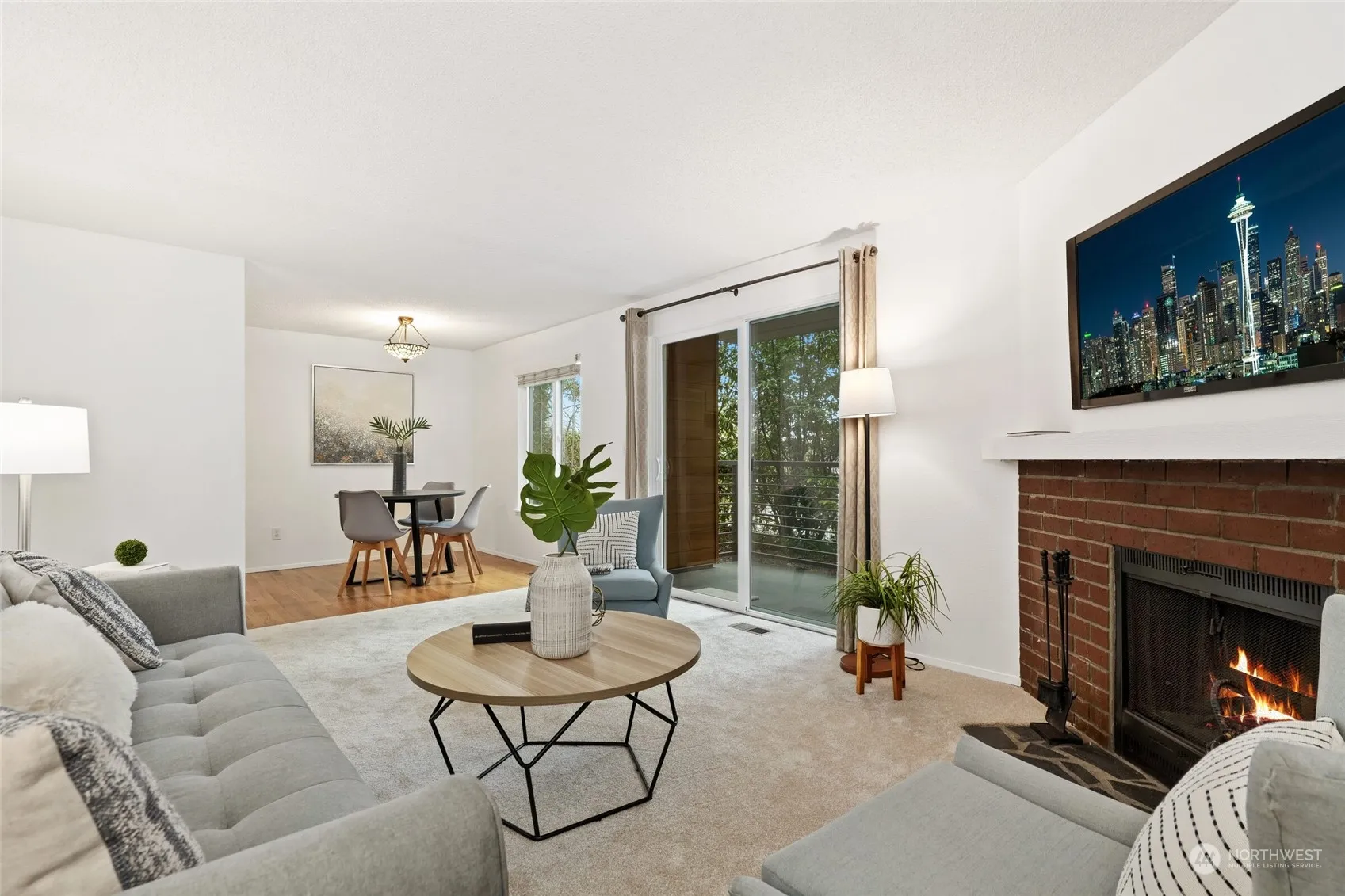 Beautifully refreshed inside and out, this ground floor condo has a superb location (Quiet 2-lane section of Bel Red), just 3 blocks from the new Wilburton light rail station, opening in April! Imagine a car-less commute to downtown Bellevue, the Spring District tech center, Microsoft, and eventually to Seattle and SeaTac. Entire complex building envelope new in 2022 (siding, windows, roofs). All brand new carpet, vinyl and interior paint in 2024. Updated appliances in cheerful white kitchen, cozy brick fireplace in living room. Private deck with attached storage closet, 2 assigned parking spaces. No rental cap. Completely move-in ready, quality affordable living in the heart of all that Bellevue has to offer!